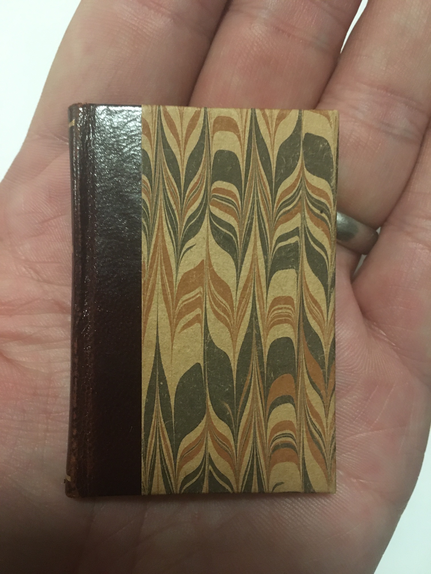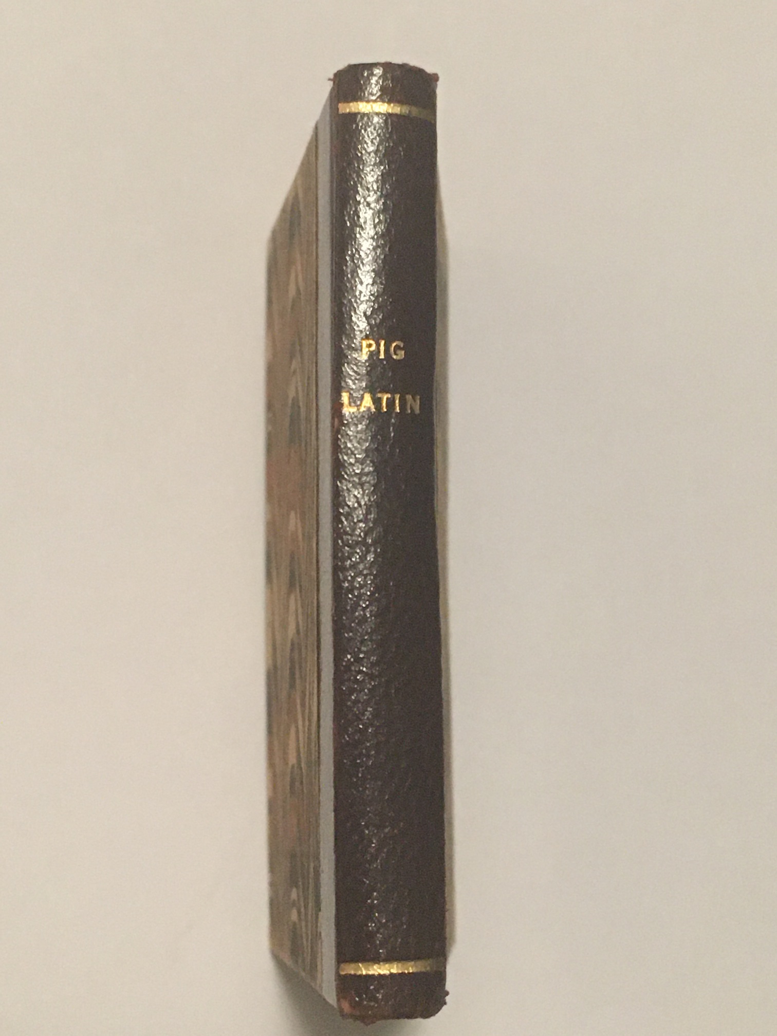 A miniature book, quarter brown moroccan leather and marbled boards. "PIG | LATIN" in gilt on spine.