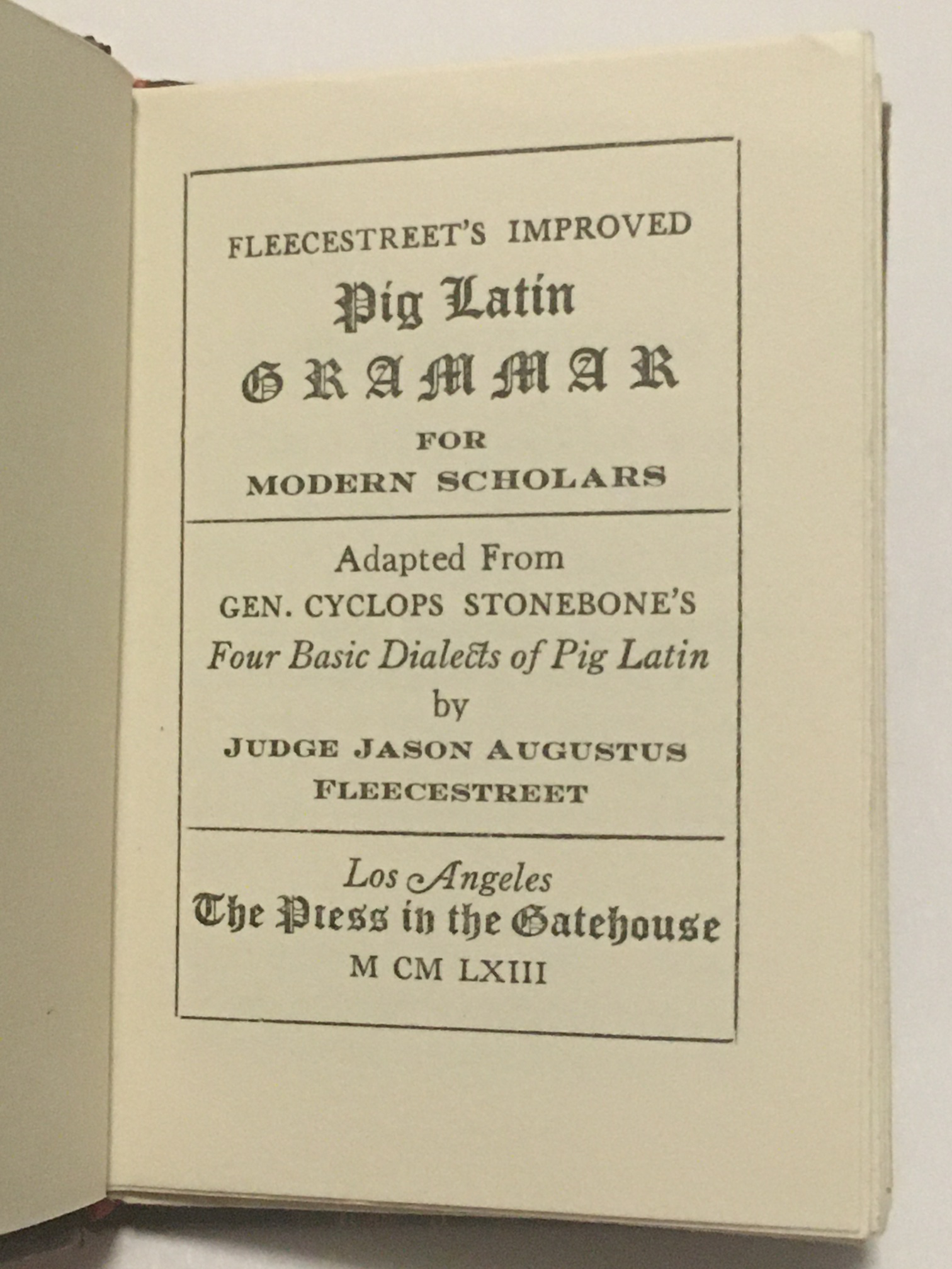 "Fleecestreet's Improved | PIG LATIN | GRAMMAR | for Modern Scholars | Adapted From | Gen. Cyclops Stonebone's | Four Basic Dialects of Pig Latin | by | Judge Jason Augustus | Fleecestreet | Los Angeles | The Press in the Gatehouse | M CM LXIII"