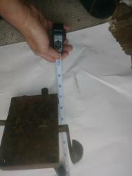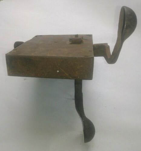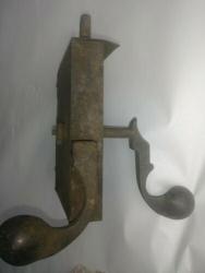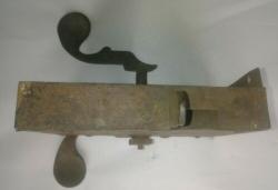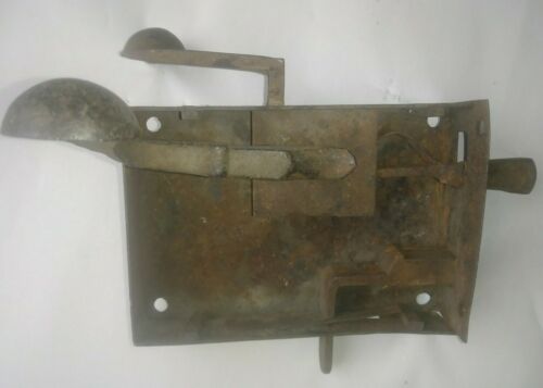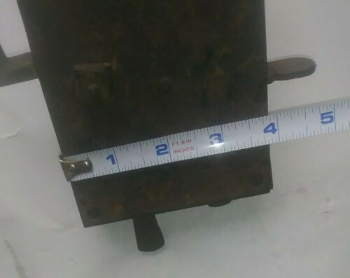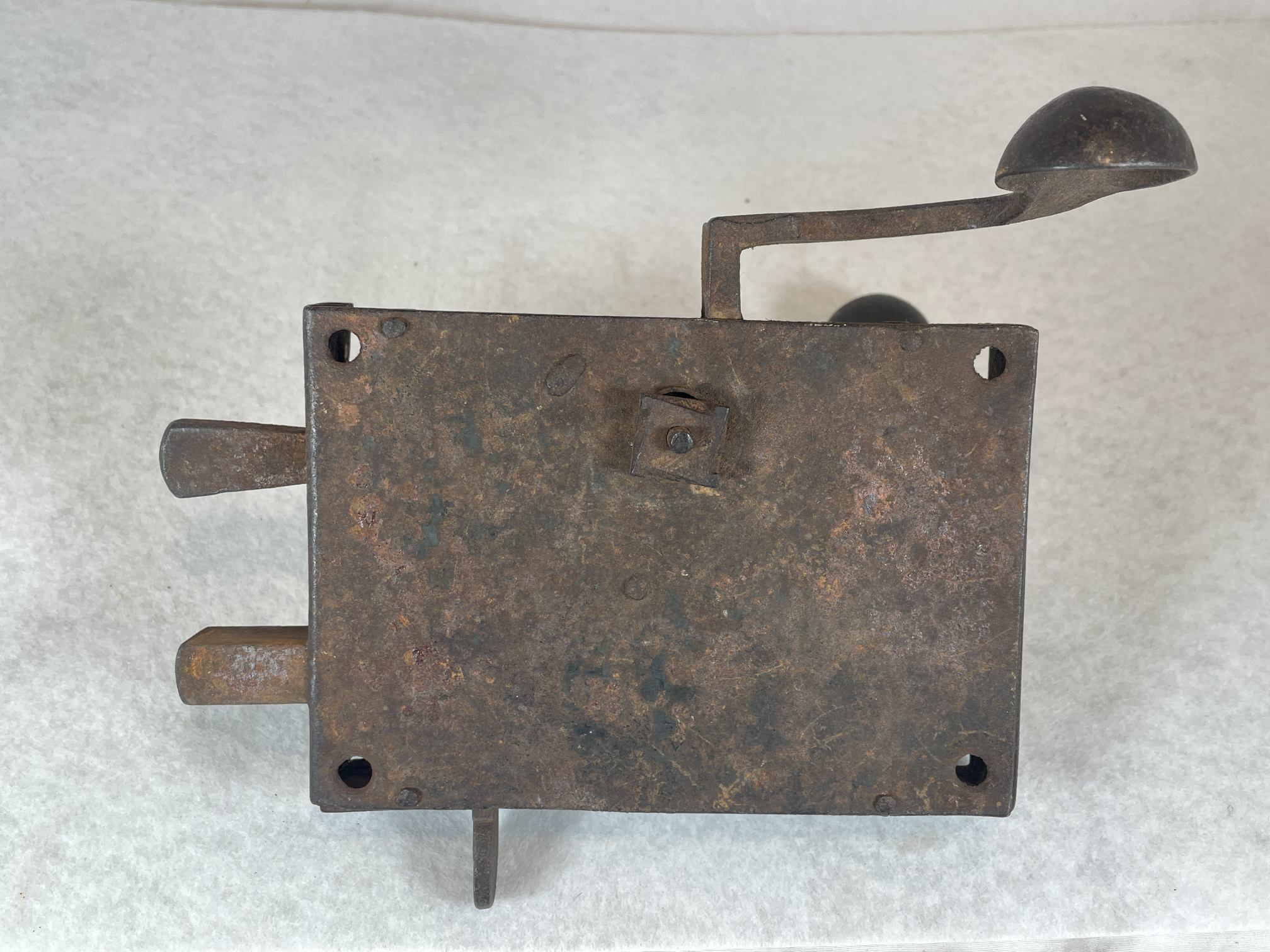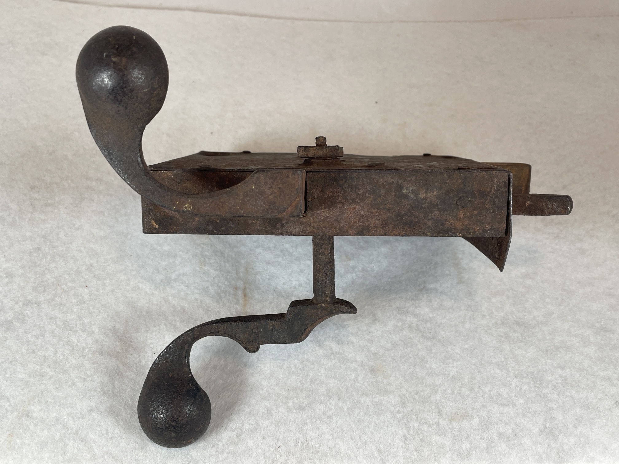Simple iron door latch, made of riveted sheet iron (one large piece covering the edge of the door, and the back of the plate, and another piece covering the remaining three sides. Top and bottom are rivetted to the front using irregular rectangular pegs. Inside handle and latch are a single piece. Outside handle fits through a squared-off hole at the bend of the inside handle/latch, and is attached with a chamfered square nut on the inside of the door.