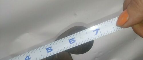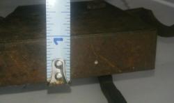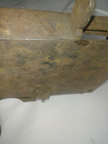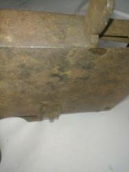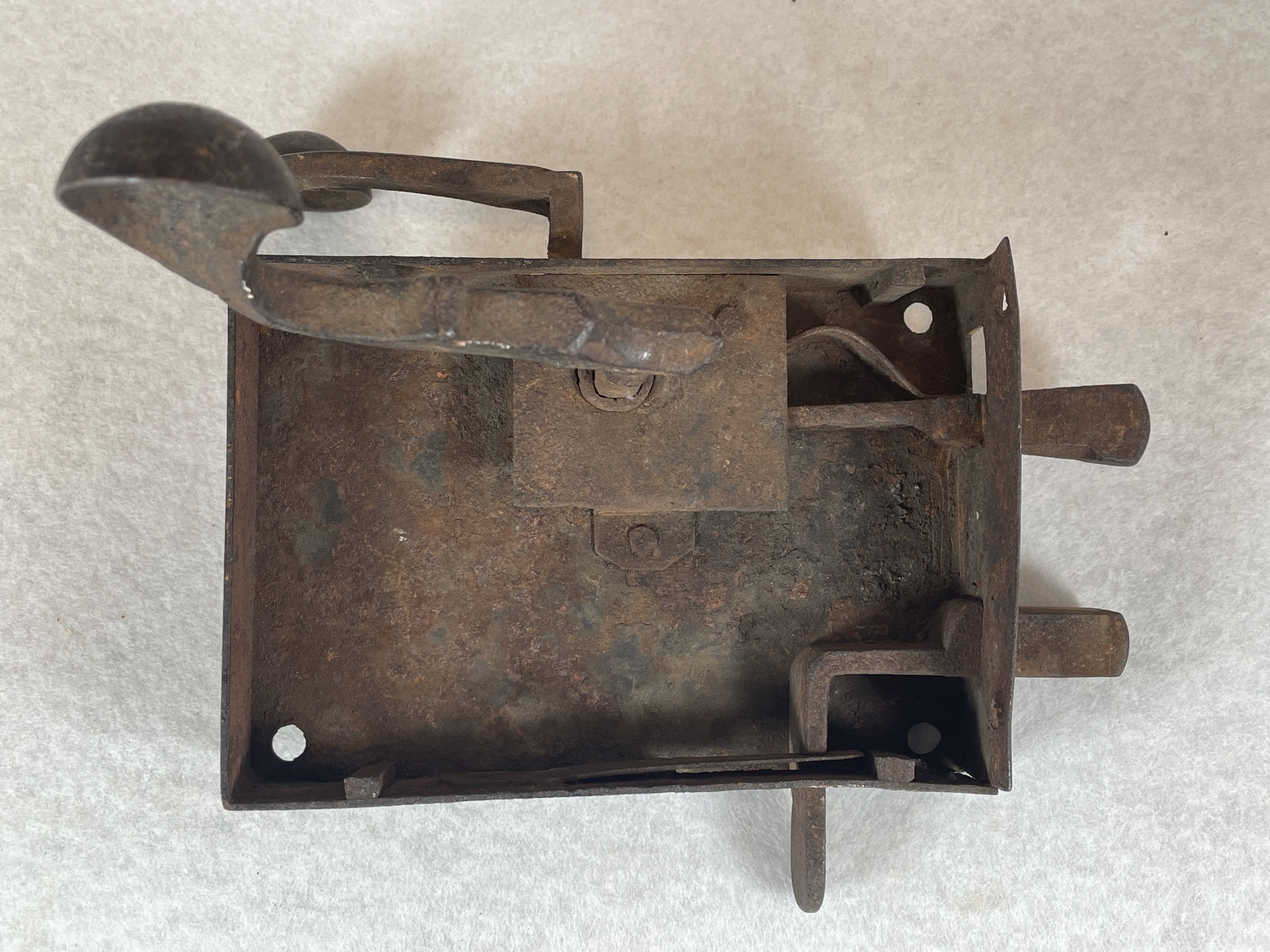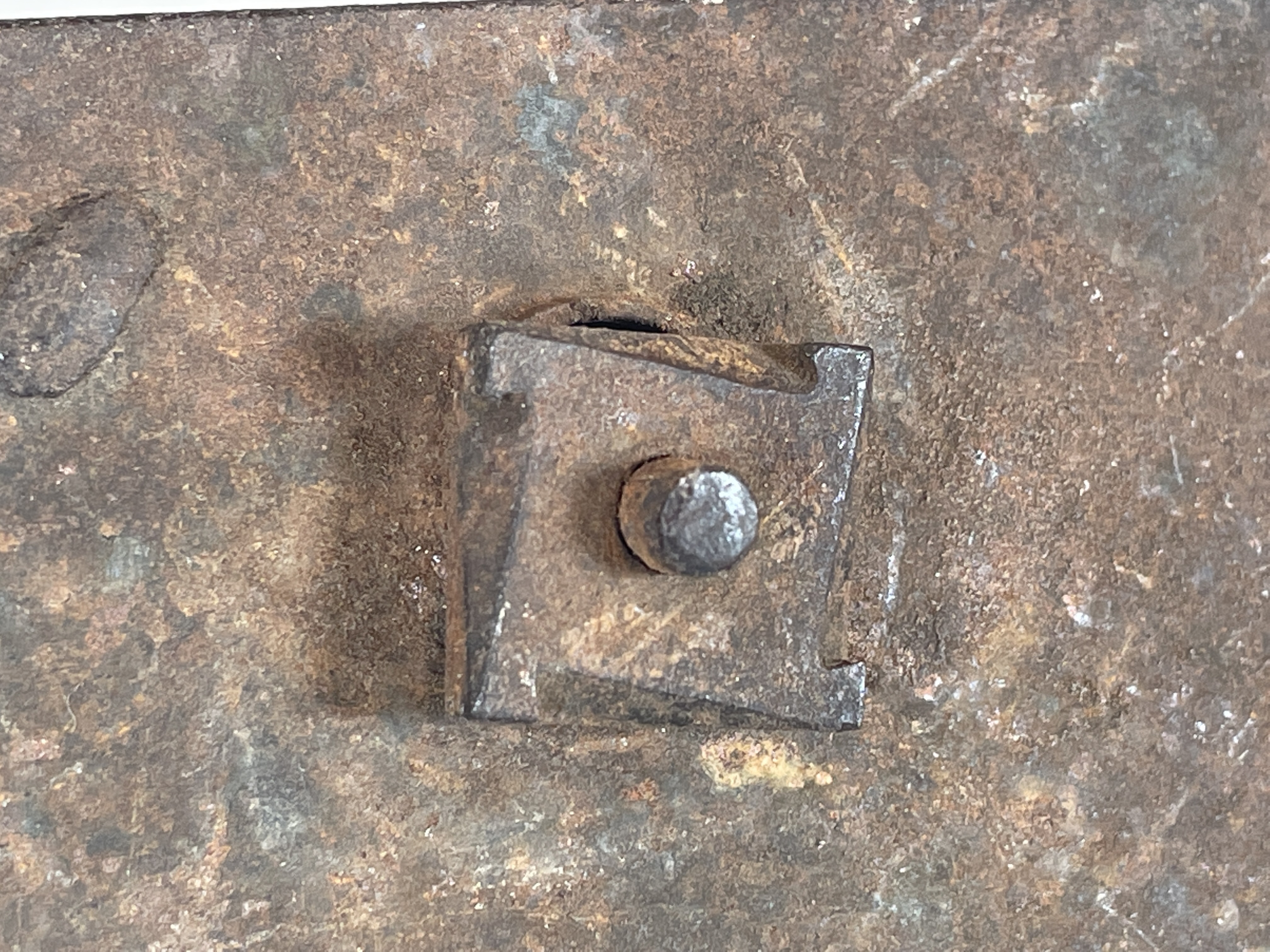 Some pitting, especially inside. A few spots show what appears to be the original blackened (blued?) finish. Remnants of white paint on the door edge.