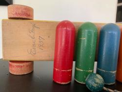 Original tri-color pull-string is 22" long, with green ball, in excellent shape except for three knots.