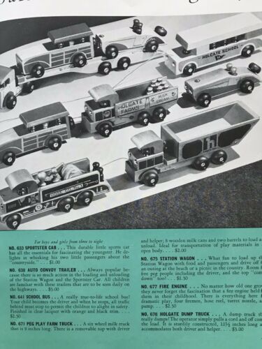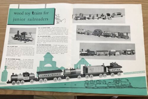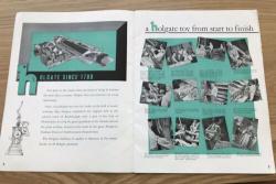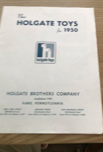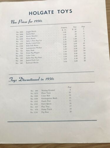 | Description | Blue on white, two leaves on heavily sized paper. Shows several new toys for 1950. On back are lists of new prices for 1950, as well as toys being discontinued in 1950. Found inserted in "holgate toys", catalog #25, 1949 (3rd copy) . | |
