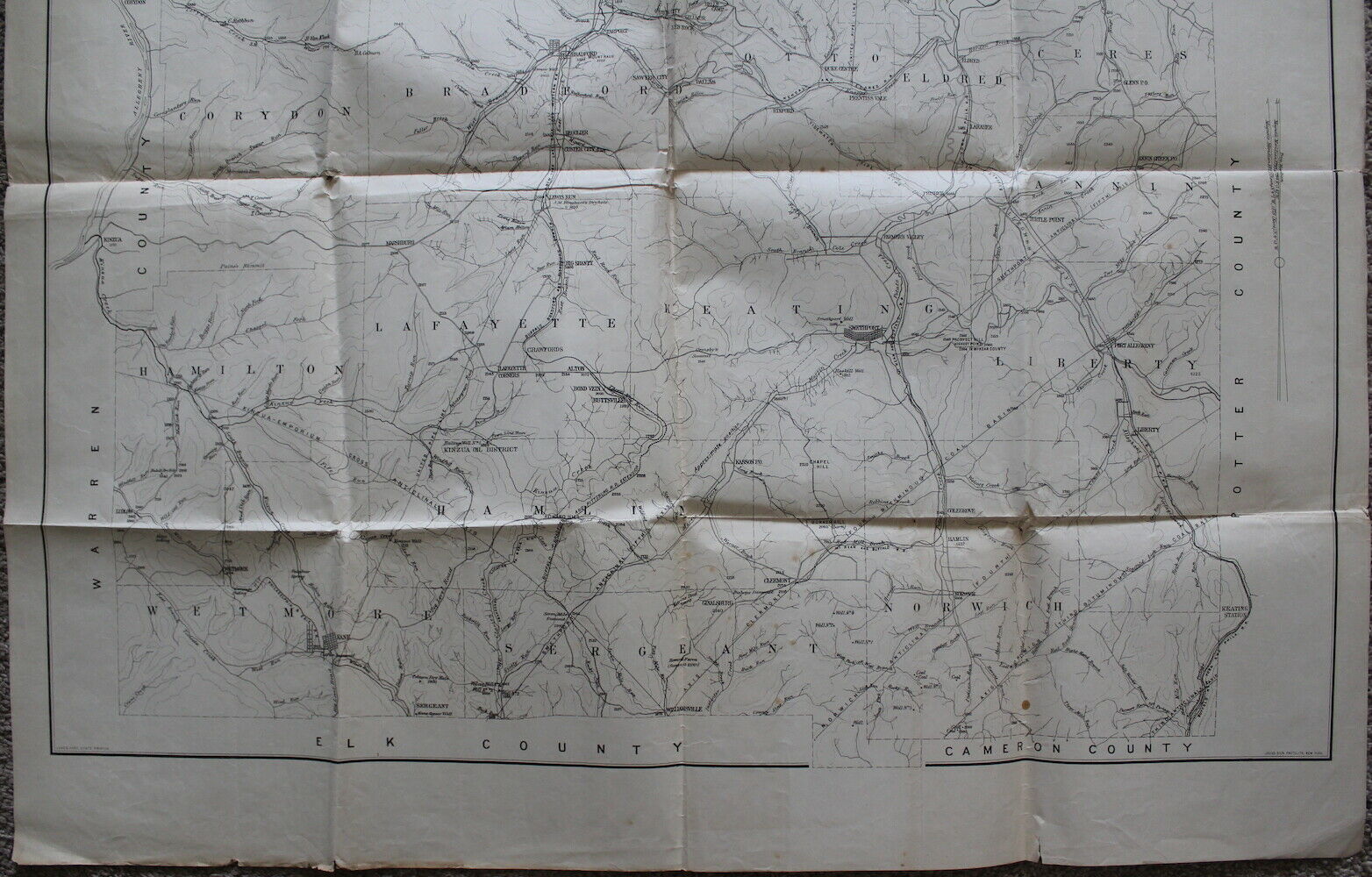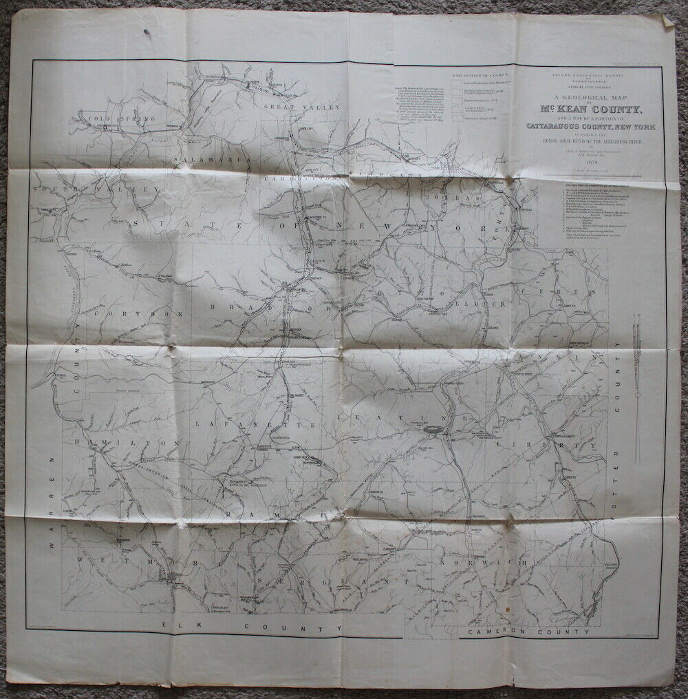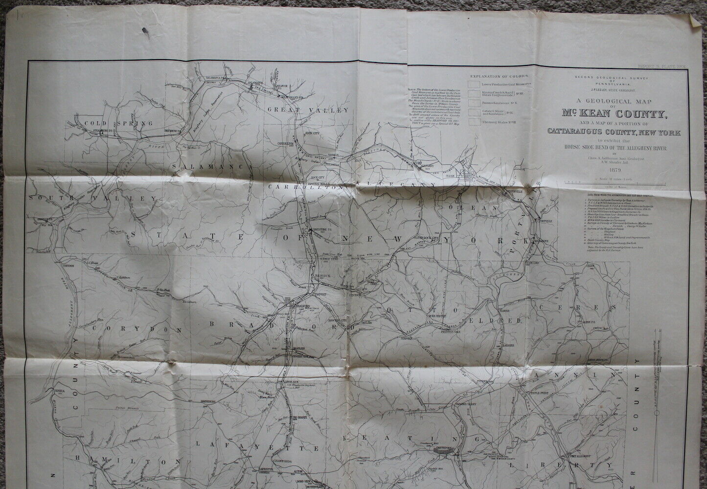 "SECOND GEOLOGICAL SURVEY | OF | PENNSYLVANIA. | J.P. LESLEY, STATE GEOLOGIST. | A GEOLOGICAL MAP | OF | McKEAN COUNTY, | AND A MAP OF A PORTION OF | CATTARAUGUS COUNTY, NEW YORK | to exhibit the | HORSE-SHOE BEND OF THE ALLEGHENY RIVER. | BY | Chas. A. ASHBURNER, Asst. Geologist. | A.W. Sheafer, Aid. | 1879. | Scale: 1 1/2 miles = 1 inch."