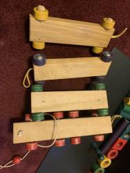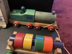 | Description | Very little wear to train or box. A single ring (likely blue) is missing, otherwise complete. Appears to be nearly identical to Holgate #1212 Activity Train with box, with the only difference being only the 3-peg car has wooden axles on this one. The rest have steel axles. I would date this to 1945-1946, based on the transition from the original wartime wooden axles to steel. |