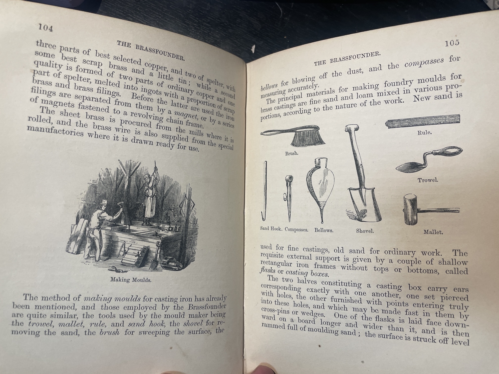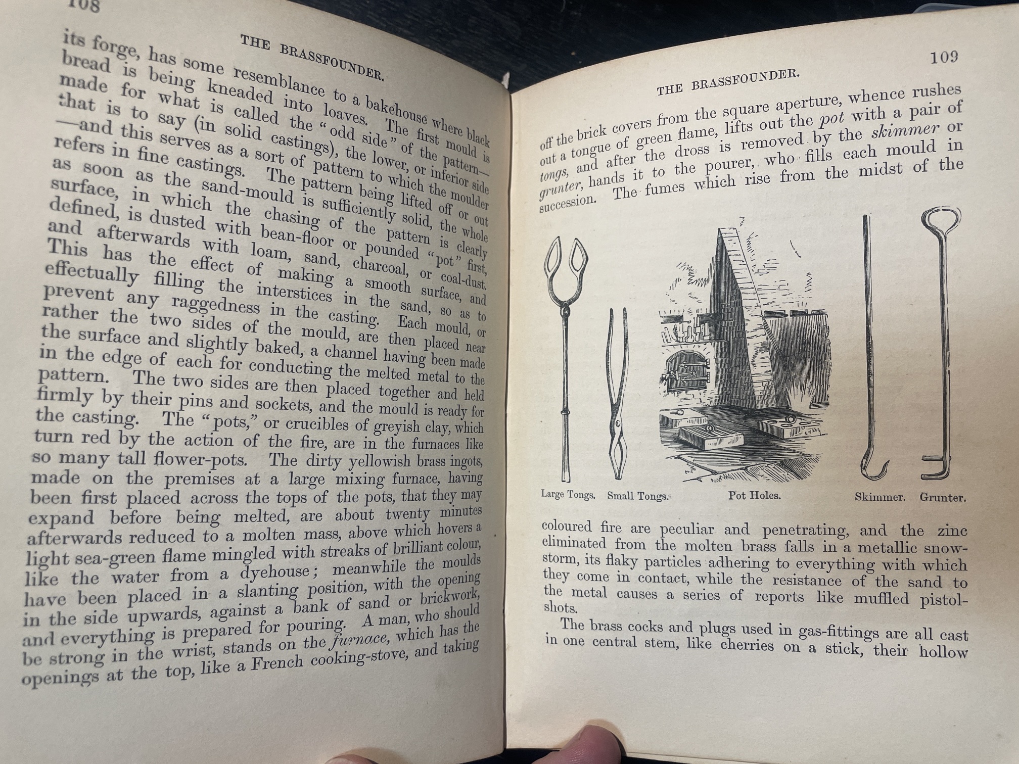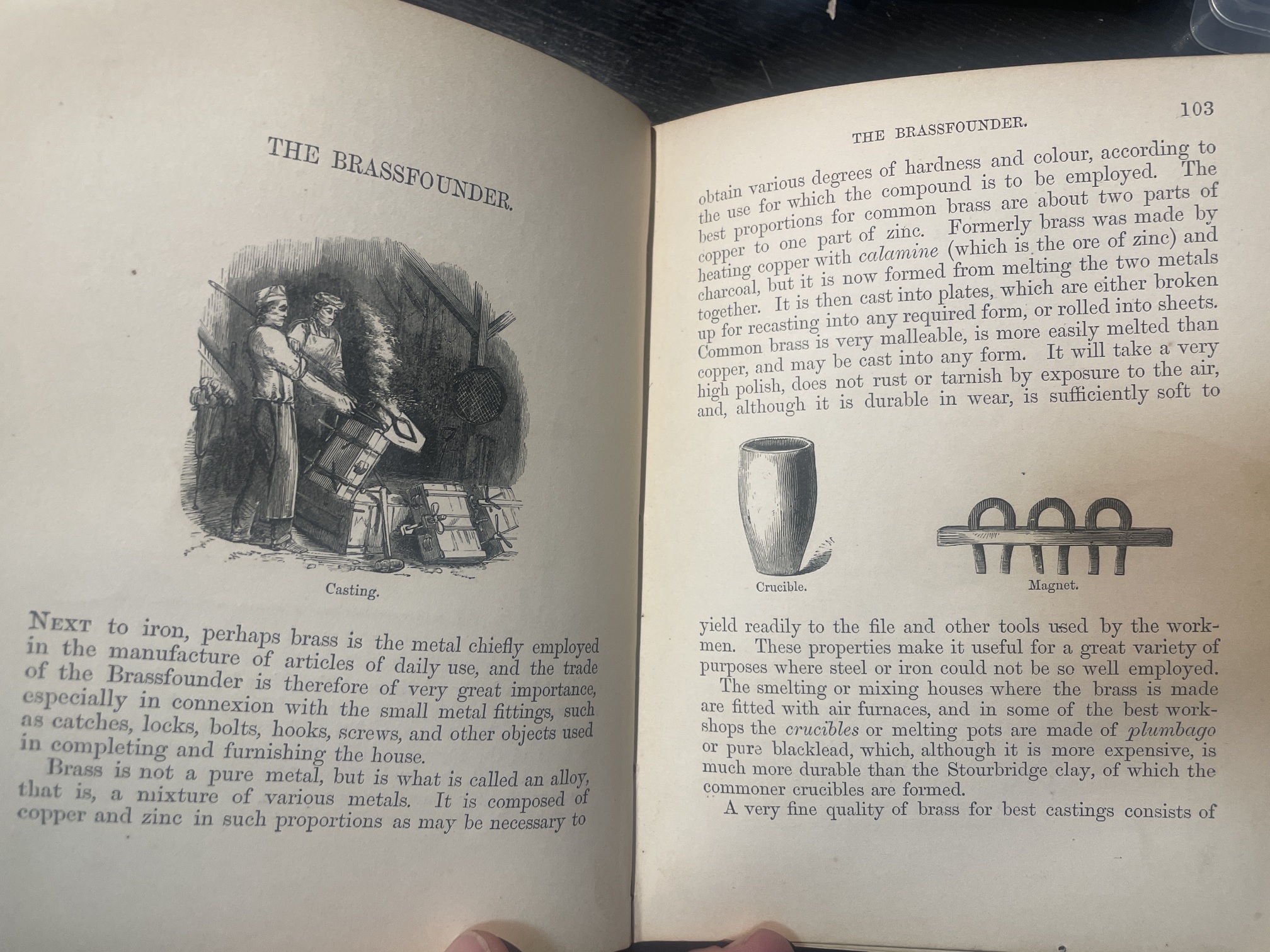 Half-calf, with marbled board, end-papers, and edges. Some damage to spine and boards. Front board and endpaper detached. "BOY'S | BOOK OF | TRADES" on red label to spine.