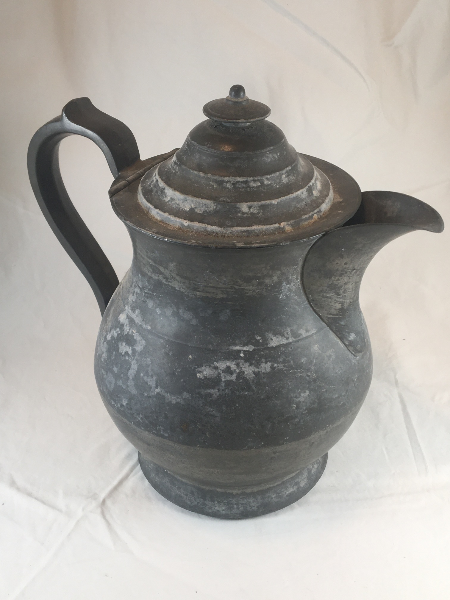 | Description | Large covered (lidded) water pitcher, with pewter finial and handle. See: "A History of American Pewter" p131,246. |