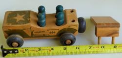 Complete except for pull-string and ball. Marked "HOLGATE 664" on the left side. Wooden axles. Four blue-green un-helmeted soldiers. |