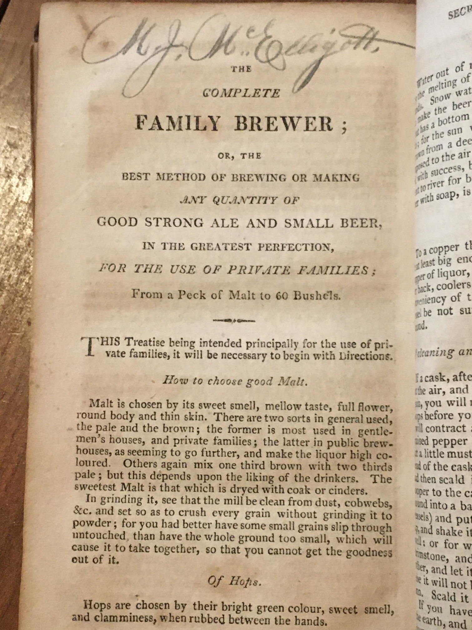 "The | Complete | FAMILY BREWER | or, the | Best method of brewing or making | any quantity of | Good Strong Ale and Small Beer, | in the greatest perfection, | For the use of Private Families; | From a Peck of Malt to 60 Bushels."