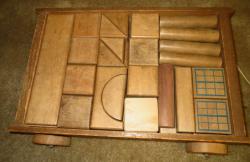 Axles are steel, 1/4" diameter by 2 1/2" long, press fit into the wood. The front right wheel was removed to facilitate the repair.