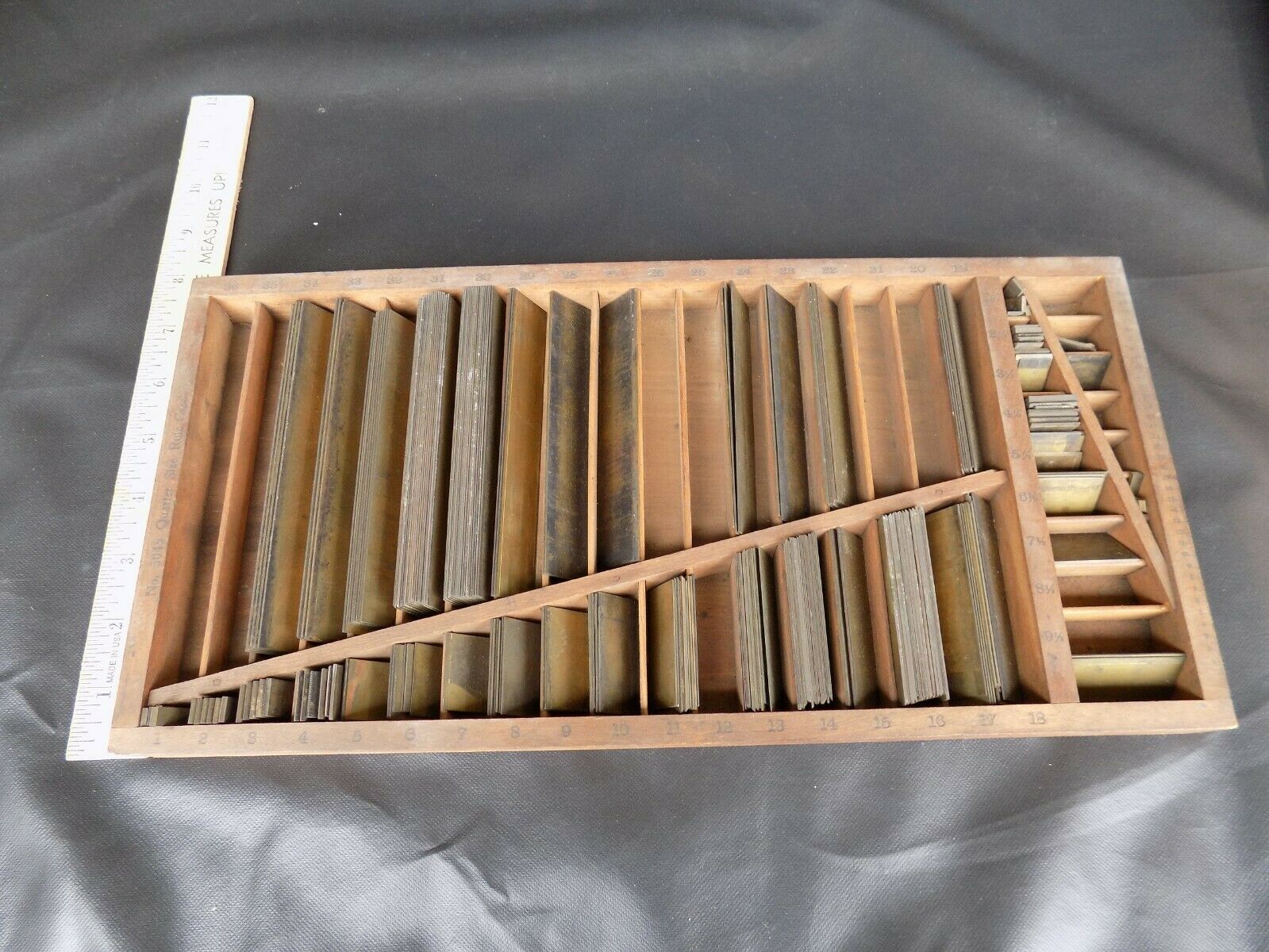 A wooden quarter-case of brass rule, with only about a dozen slots empty (though some may be mis-filed). Rule is of various thickness, and includes at least one piece of double-line. |