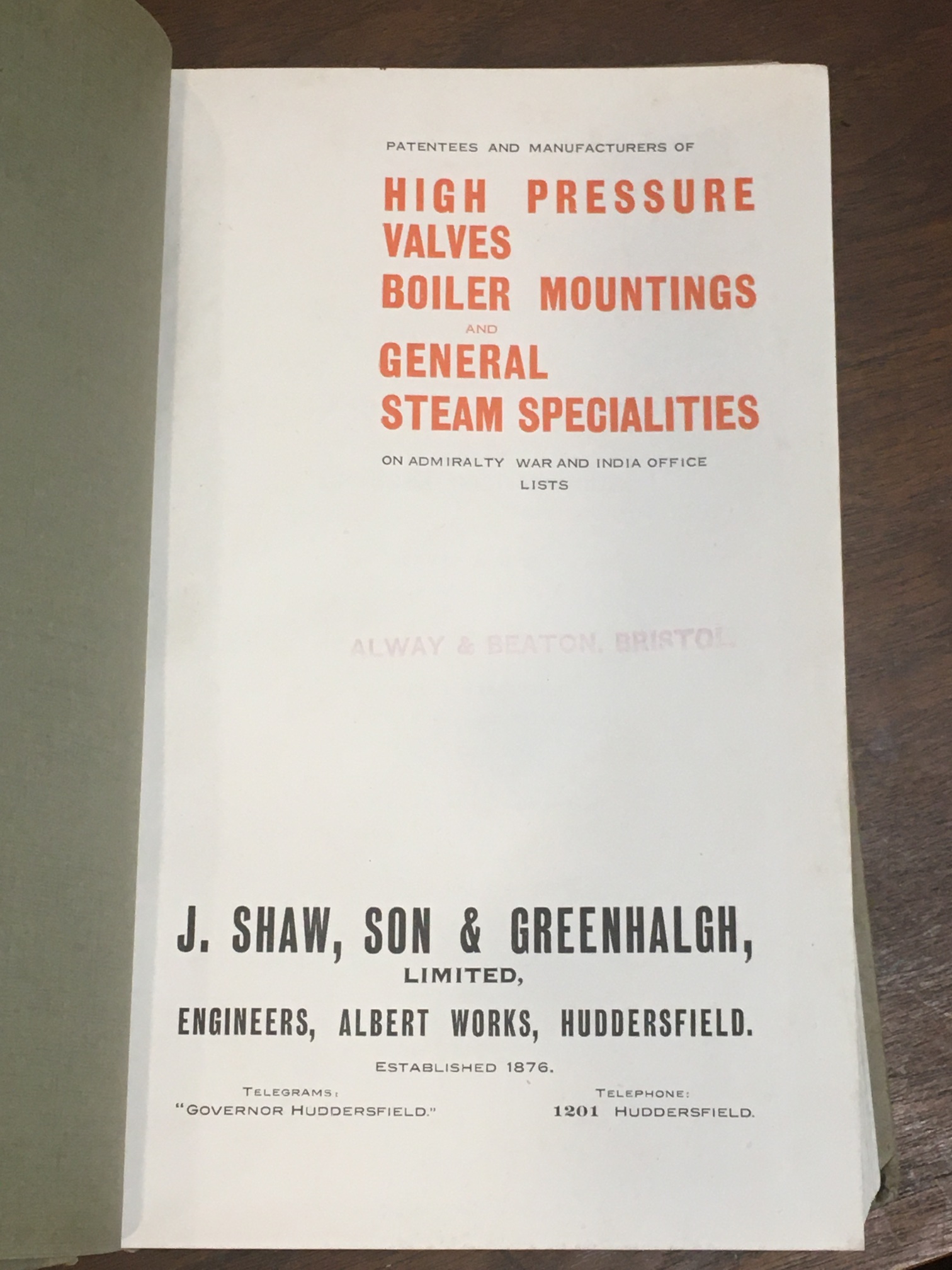 "High Pressure Valves and Boiler Mountings", Catalogue D, J. Shaw, Son & Greenhalgh Ltd.