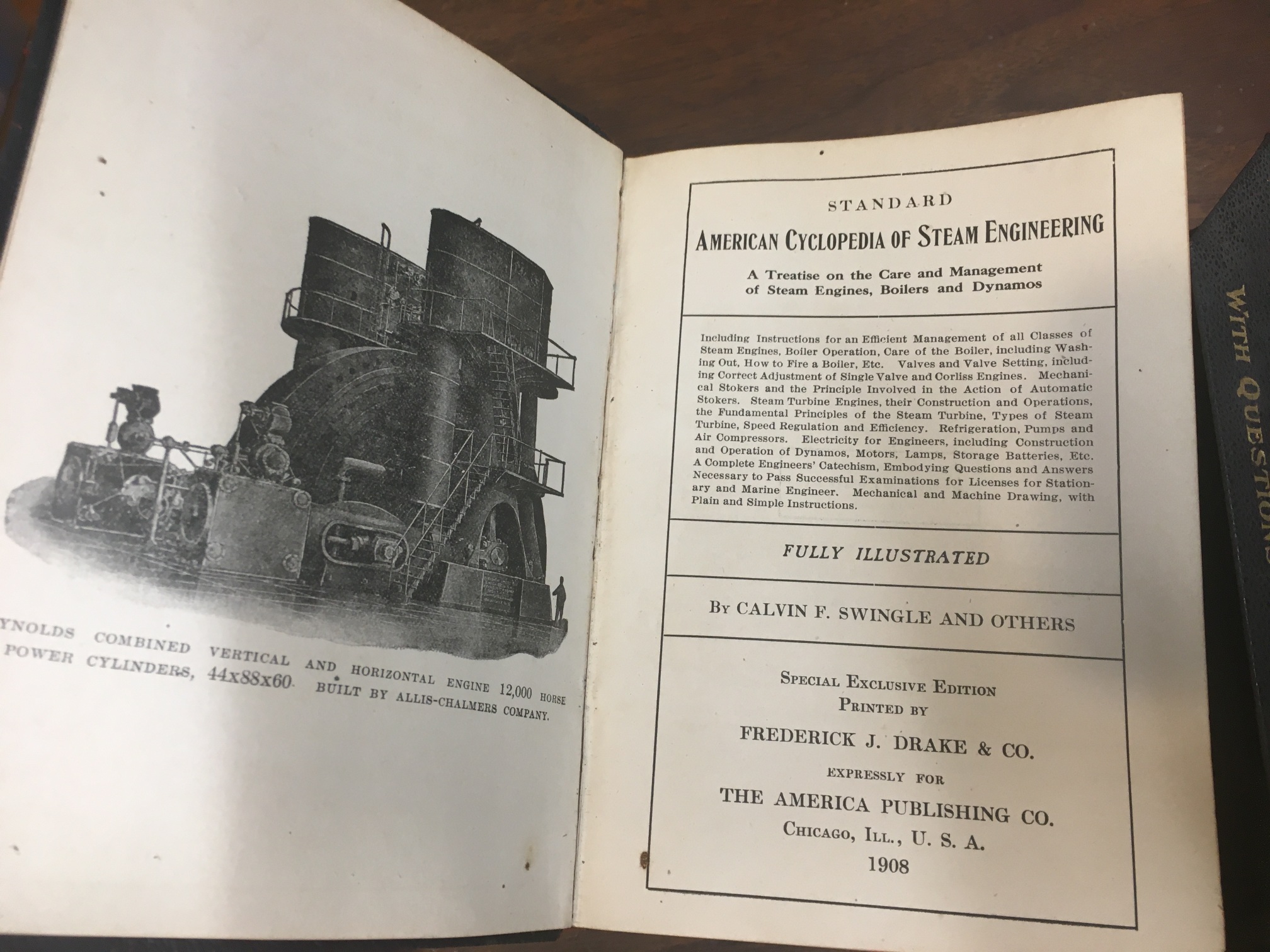 By Calvin F. Swingle and others. Black faux-leather flapped-binding, with image of a horizontal steam engine and a dynamo on the cover in gilt. 1908.