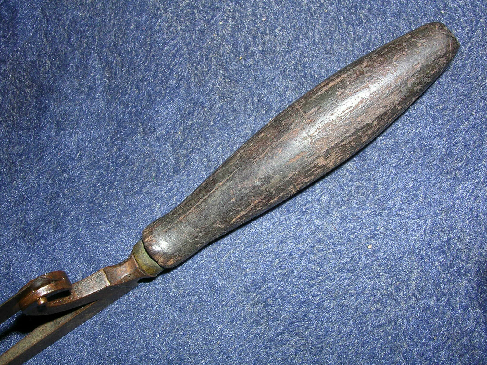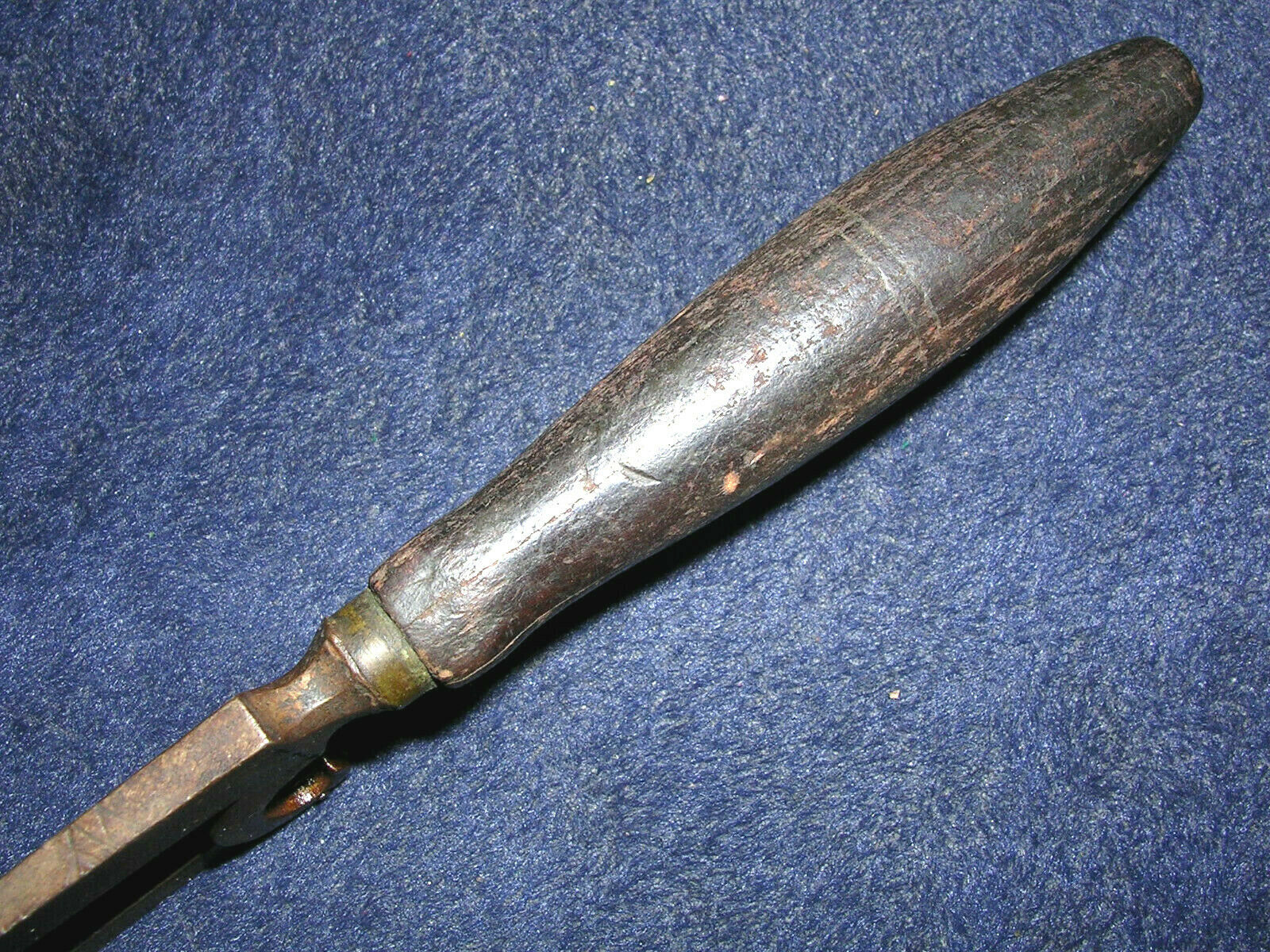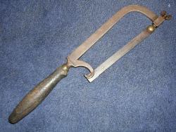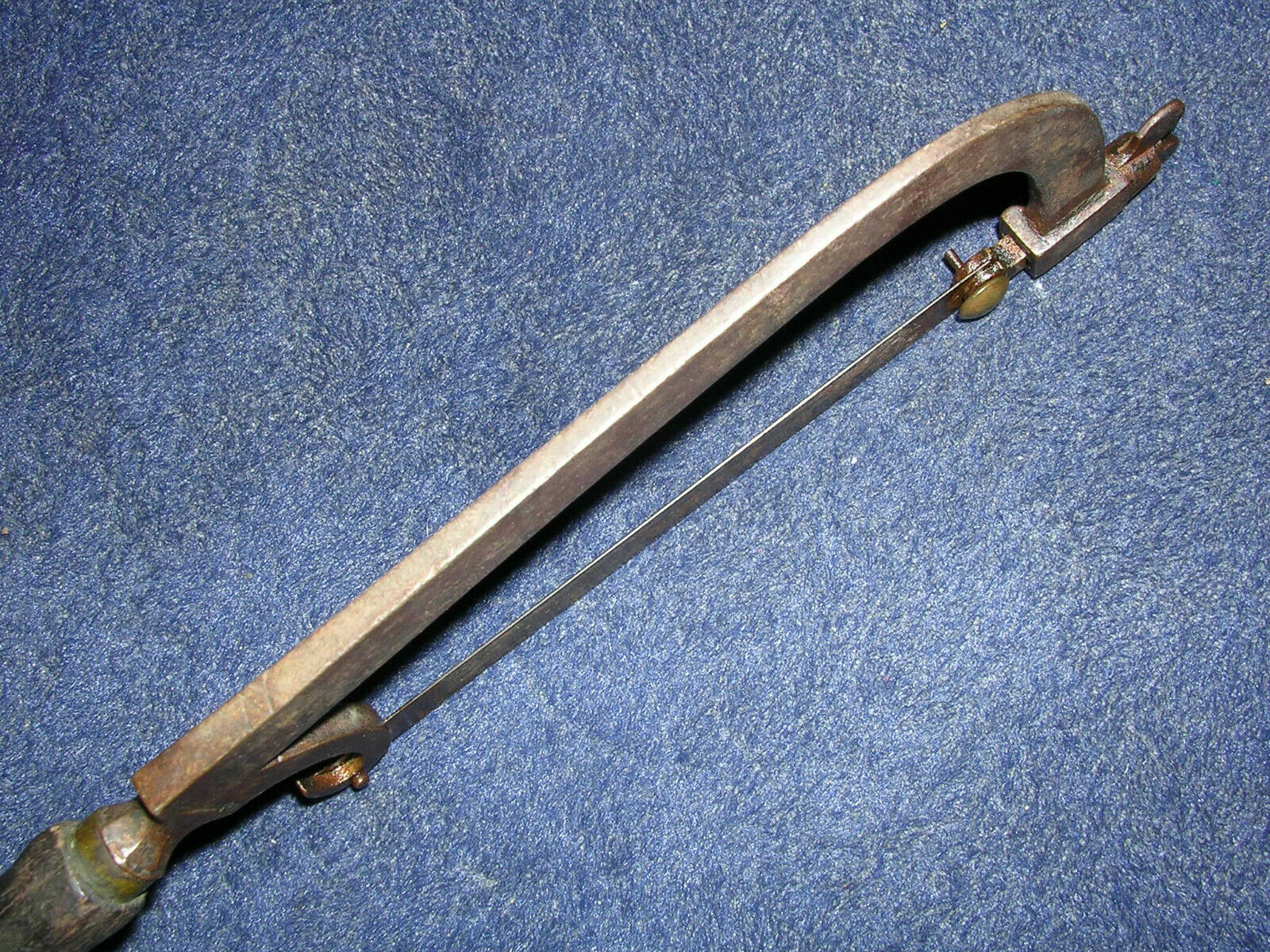 | Description | Small hand-forged Lancashire-style hacksaw with 4 1/4" blade. Top arm is marked "PS [turned CC 90 degrees] STUBS, next to another mark which may be "2 2" or "2" next to "C1". Wooden handle is well-worn, but two thread-lines are apparent in the middle. The tang is bent over the end of the wooden handle. The bearing (terminology?) at the front of the arm is square. Stubs catalogs show these as cylinders by (date needed...1851?). See Stubs catalogs in "Horological Shop Tools 1700 to 1900", T.R. Crom (pp. 185, 200, 209). |