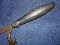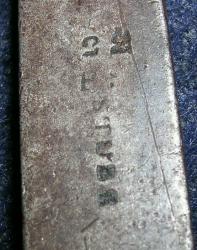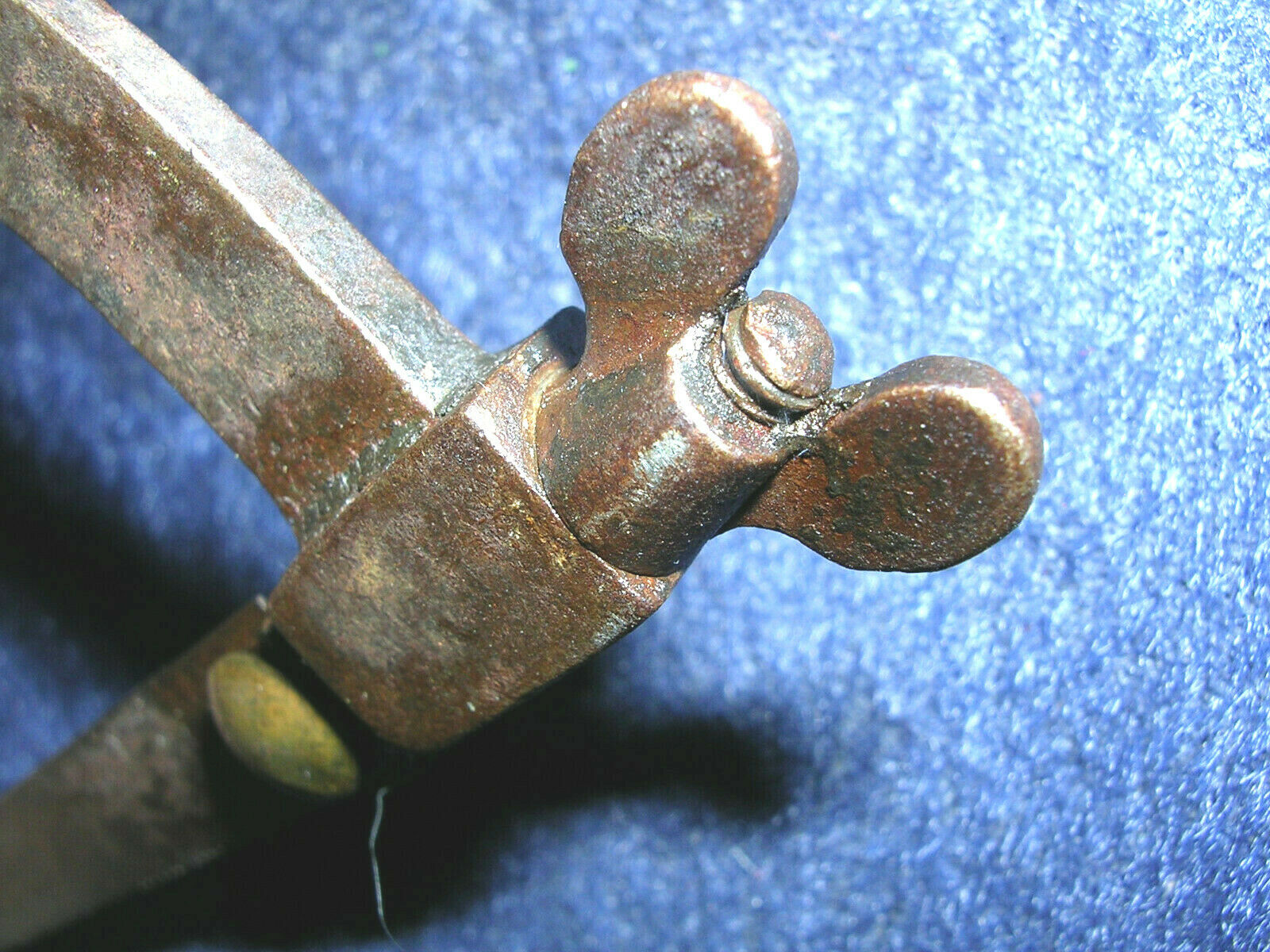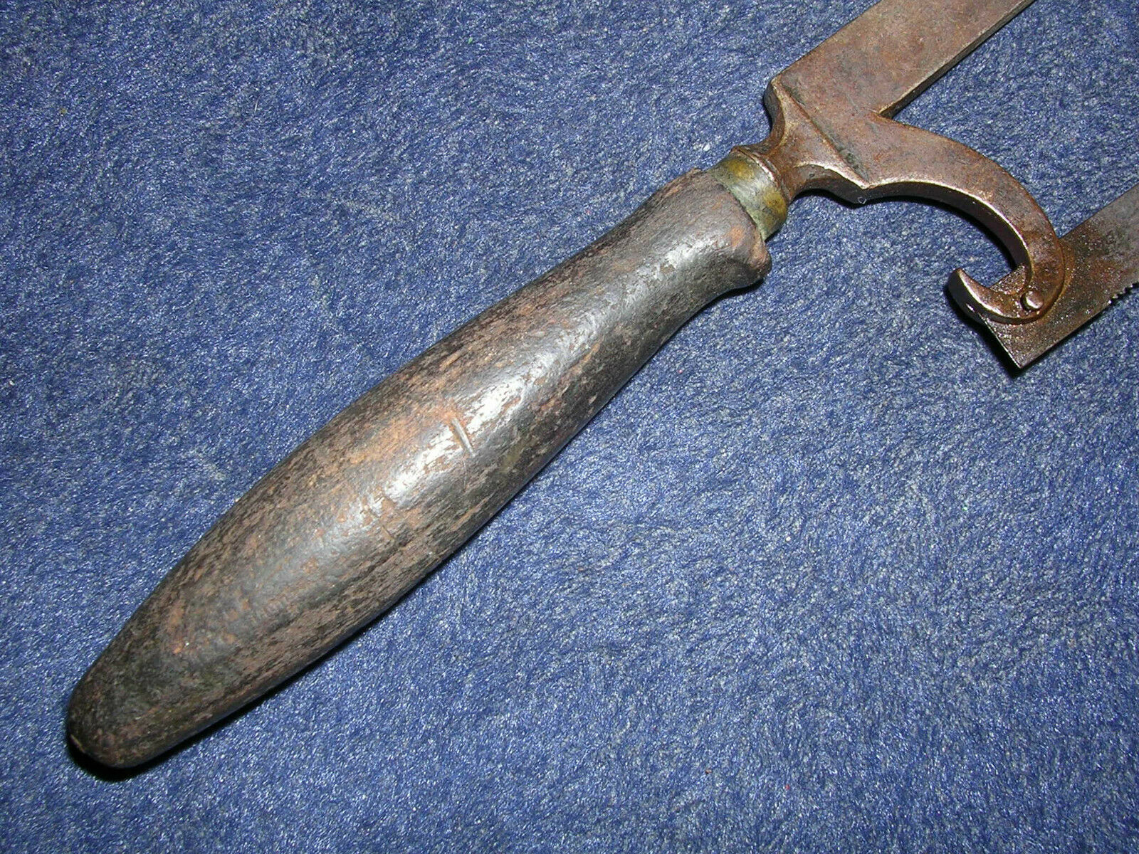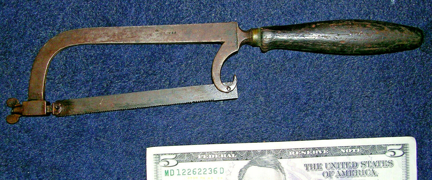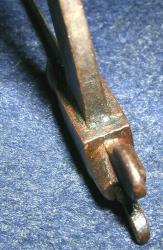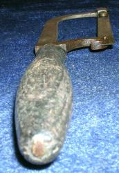 | Description | Small hand-forged Lancashire-style hacksaw with 4 1/4" blade. Top arm is marked "PS [turned CC 90 degrees] STUBS, next to another mark which may be "2 2" or "2" next to "C1". Wooden handle is well-worn, but two thread-lines are apparent in the middle. The tang is bent over the end of the wooden handle. The bearing (terminology?) at the front of the arm is square. Stubs catalogs show these as cylinders by (date needed...1851?). See Stubs catalogs in "Horological Shop Tools 1700 to 1900", T.R. Crom (pp. 185, 200, 209). |