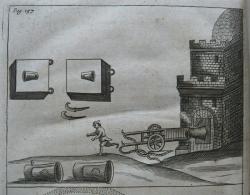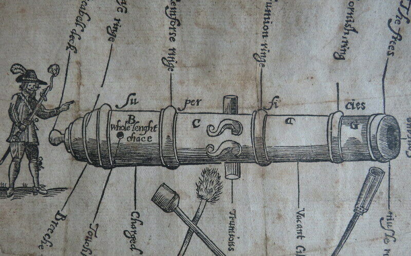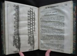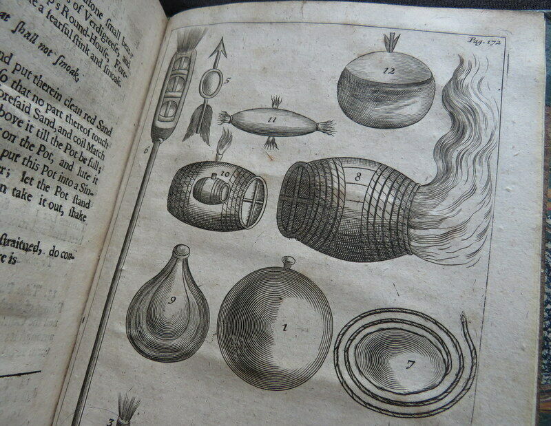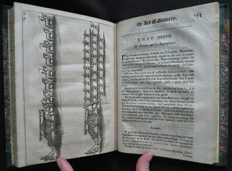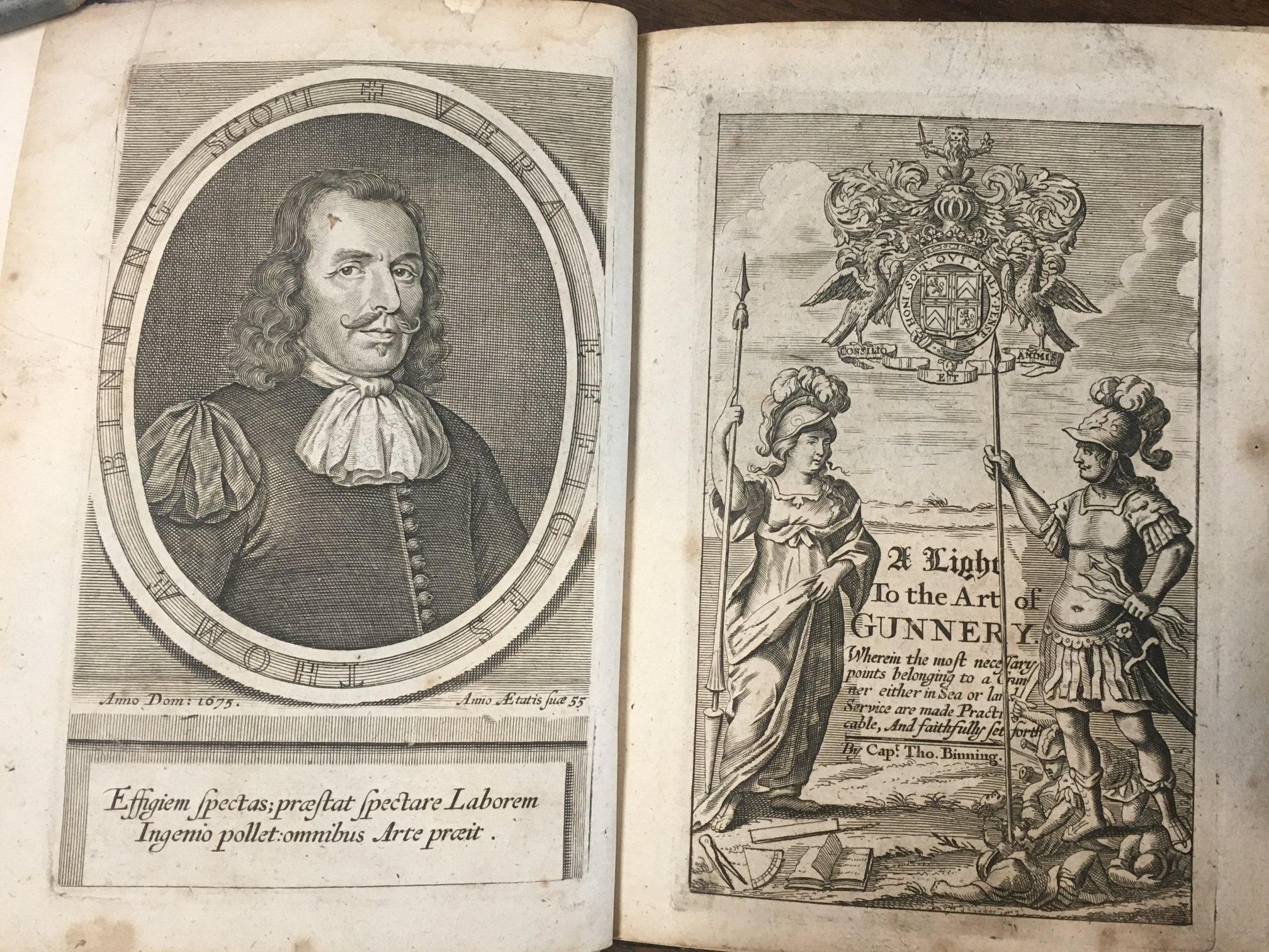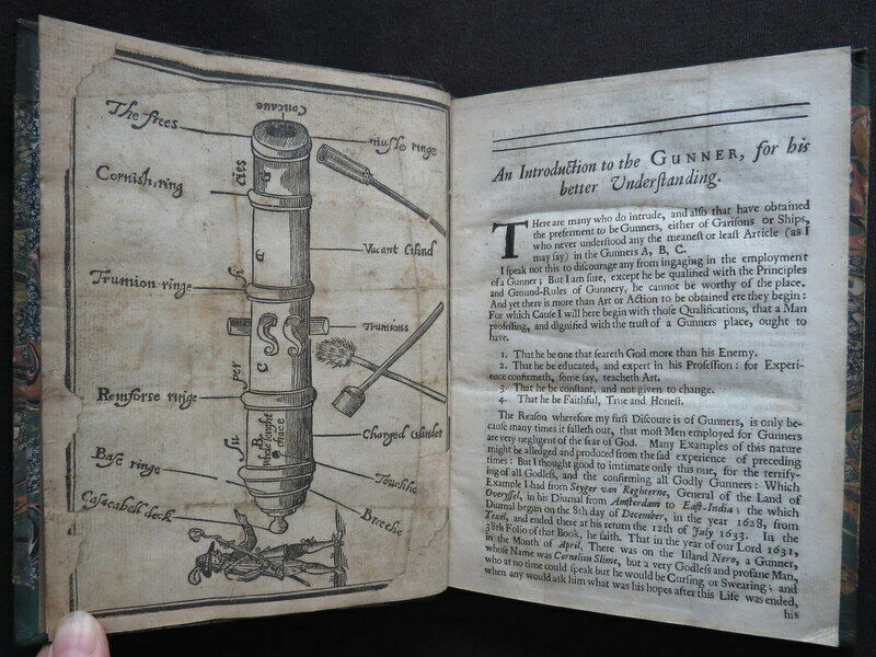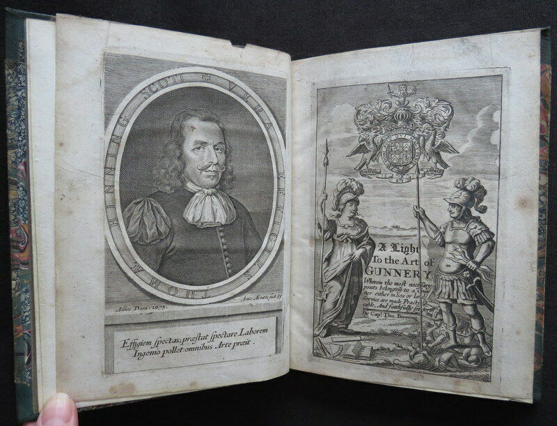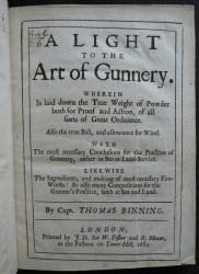 | Description | "A LIGHT | to the | Art of Gunnery. | wherein | Is laid down the True Weight of Powder | both for Proof and Action, of all | sorts of Great Ordnance. | Also the true Ball, and allowance for Wind. | with | The most necessary Conclusions for the Practice of | Gunnery, either in Sea or Land-Service. | likewise | The Ingredients, and making of most necessary Fire- | Works: As also many Compositions for the | Gunnery's Practice, both at Sea and Land. | By Capt. THOMAS BINNING. | LONDON; | Printed by J. D. for W. Fisher and R. Mount, | at the Postern on Tower-Hill, 1689." Rebound in later (19th C) green half-morocco, with beautiful marbled boards. Later end-papers. Two book plates to front, one has been obscured by scratching. The other is of Thomas Francis Fremantle. Folded woodcut of parts of a cannon from John Roberts' 'Compleat Cannoniere' inserted at A3, laid down on thick old laid paper. See "Early Military Books in the University of Michigan Libraries" #179. |