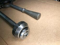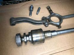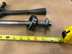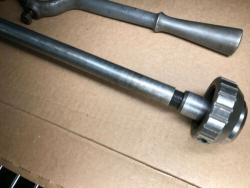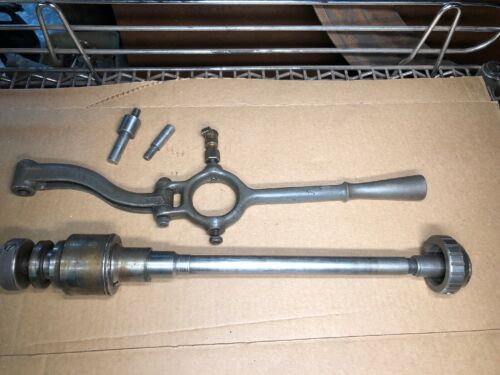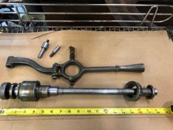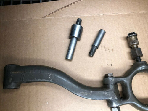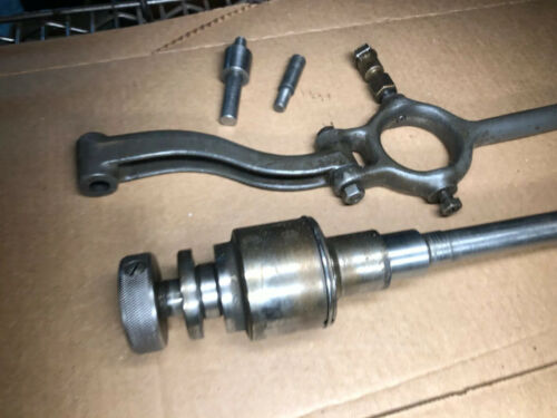 | Description | A nearly complete "old style" lever collet closer assembly, including the spindle adapter and thread protector, and one original South Bend Collet, size ???. The knurled collar is marked "HL104". It is missing the two yoke pieces. It also has two extra pieces: a mounting pin with a riser, and a sleeve on the drawbar, both apparently to fit a non-South Bend lathe. Purchased for South Bend Model A 9" Workbench Lathe with 4 1/2' Bed. |