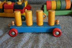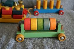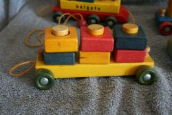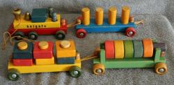 | Description | The last model "Activity Train", before it became the #1215. Complete with 2 people, 8 pegs, 5 rings, and 6 square rings. Yellow woven pull cord with red ball. "holgate" painted on the side, where a Type 5 decal is shown in the catalog. Steel axles. All couplers and posts are intact, though the coupler on the locomotive is frayed. Some posts have visible glue (later?) at the base. Compare to Holgate #1212 Activity Train (late/Type III?). |