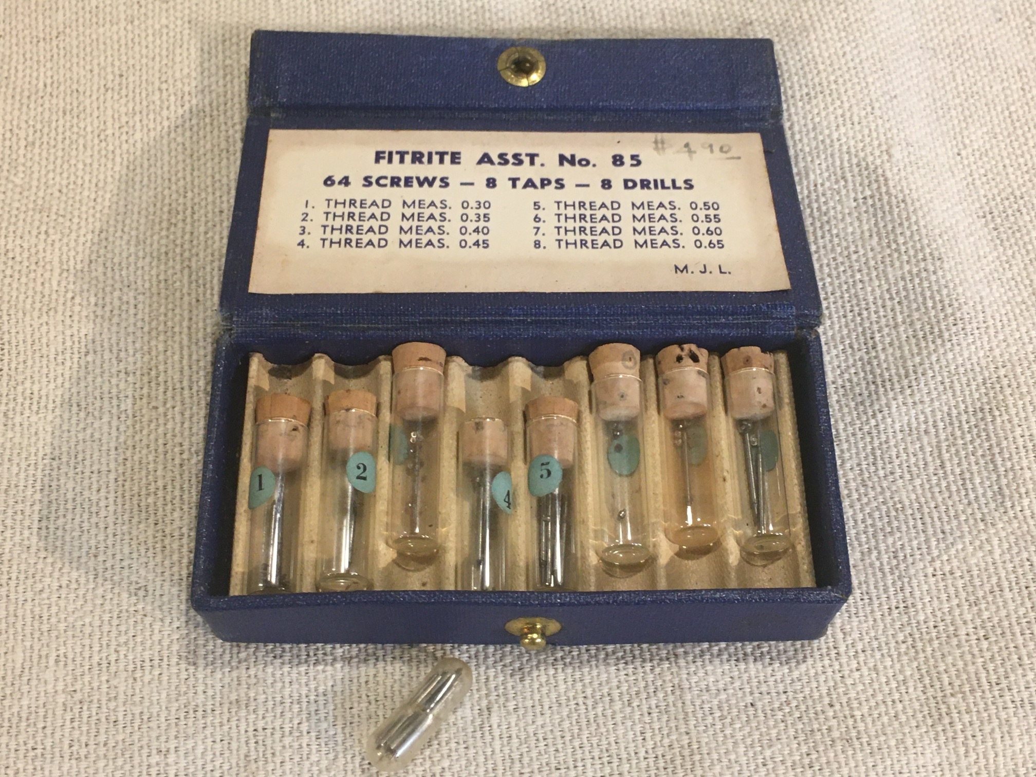 Small blue cloth-covered box with snap closure. Inside are 8 corked glass vials, each originally hold a drill, a tap, and 8 screws, in sizes from 0.30mm to 0.65mm in 0.05mm increments. At least 13 tools are visible, though they may be mis-matched or broken. Many screws remain.