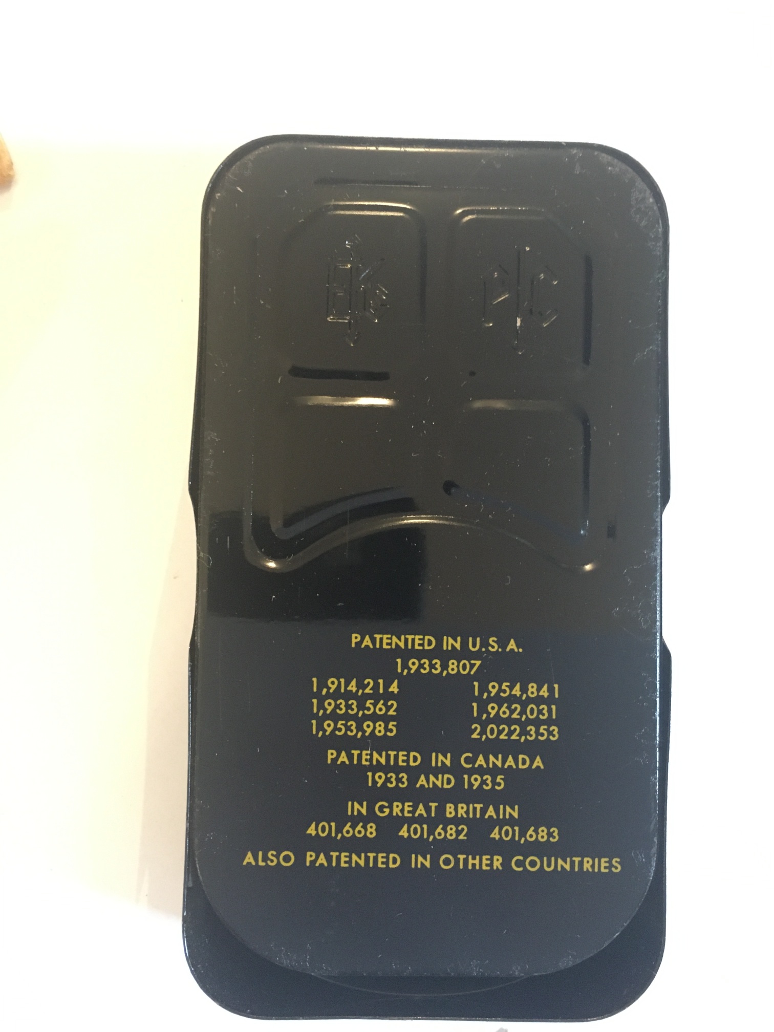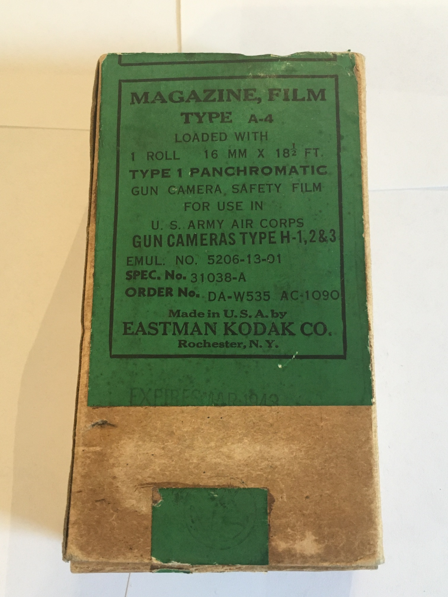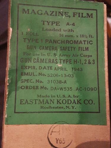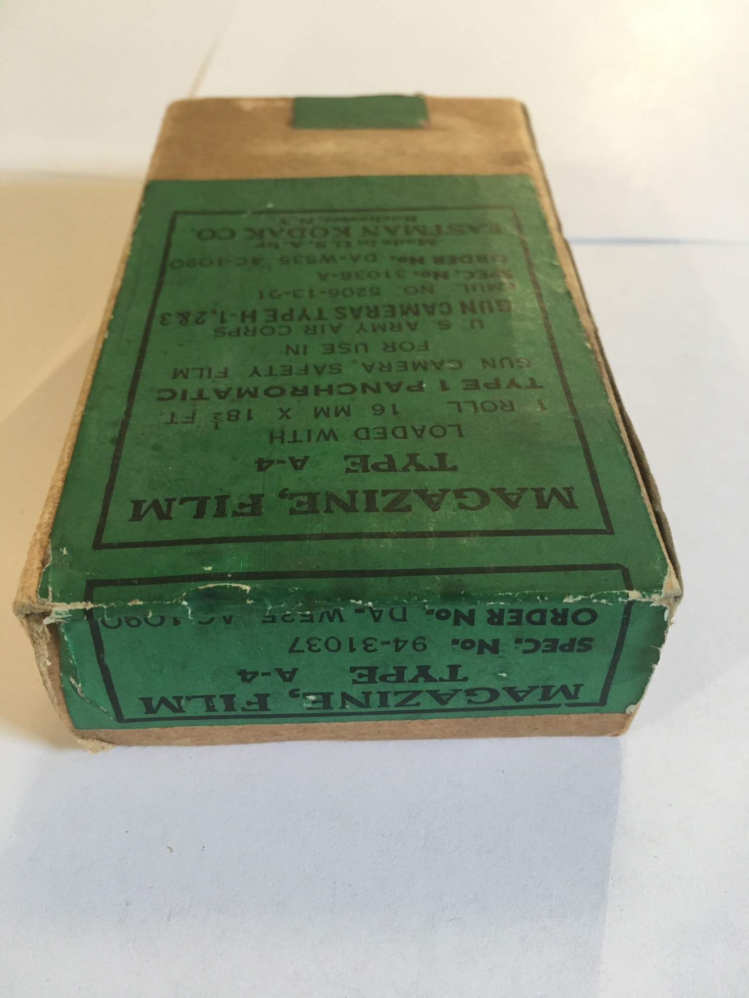 | Description | Cardboard box with green label, containing an unused A-4 film magazine in a stamped steel two part box, similar to a traveling soap-box. The magazine and box are painted black. Label states: "MAGAZINE, FILM | TYPE A-4 | LOADED WITH | 1 ROLL 16 mm x 18 1/2 ft. | TYPE 1 PANCHROMATIC | GUN CAMERA SAFETY FILM | FOR USE IN | U. S. ARMY AIR CORPS | GUN CAMERAS TYPE H-1, 2 & 3 | EMUL. No. 5206-13-01 | SPEC. No. 31038-A | ORDER No. DA-W535 AC-1090 | Made in U. S. A. by | EASTMAN KODAK CO. | Rochester, N. Y.", and is stamped "EXPIRES MAR 1943". Label has a different "EMUL. No." from Magazine, Film, Type A-4, in box, with missing seal, among other less important changes. The label seals one end. The other end had a separate seal, now broken, which is marked "OPEN HERE". The magazine is sealed with black tape, and is printed with information relating to patents (up to 1935, in the U.S.). The logos of Kodak ("EK") and International Projector Corp. ("IP") are stamped into the magazine. See US Patent 2,022,353 (issued 1935). This was likely intended for use in Gun Camera, W-7B (US Type H-3), but the same cartridge, loaded with less film, would have also been used in USN Gun Camera Mark VI Mod. 3 with transit case (and USN Gun Camera, Mark VI, Model 3). |