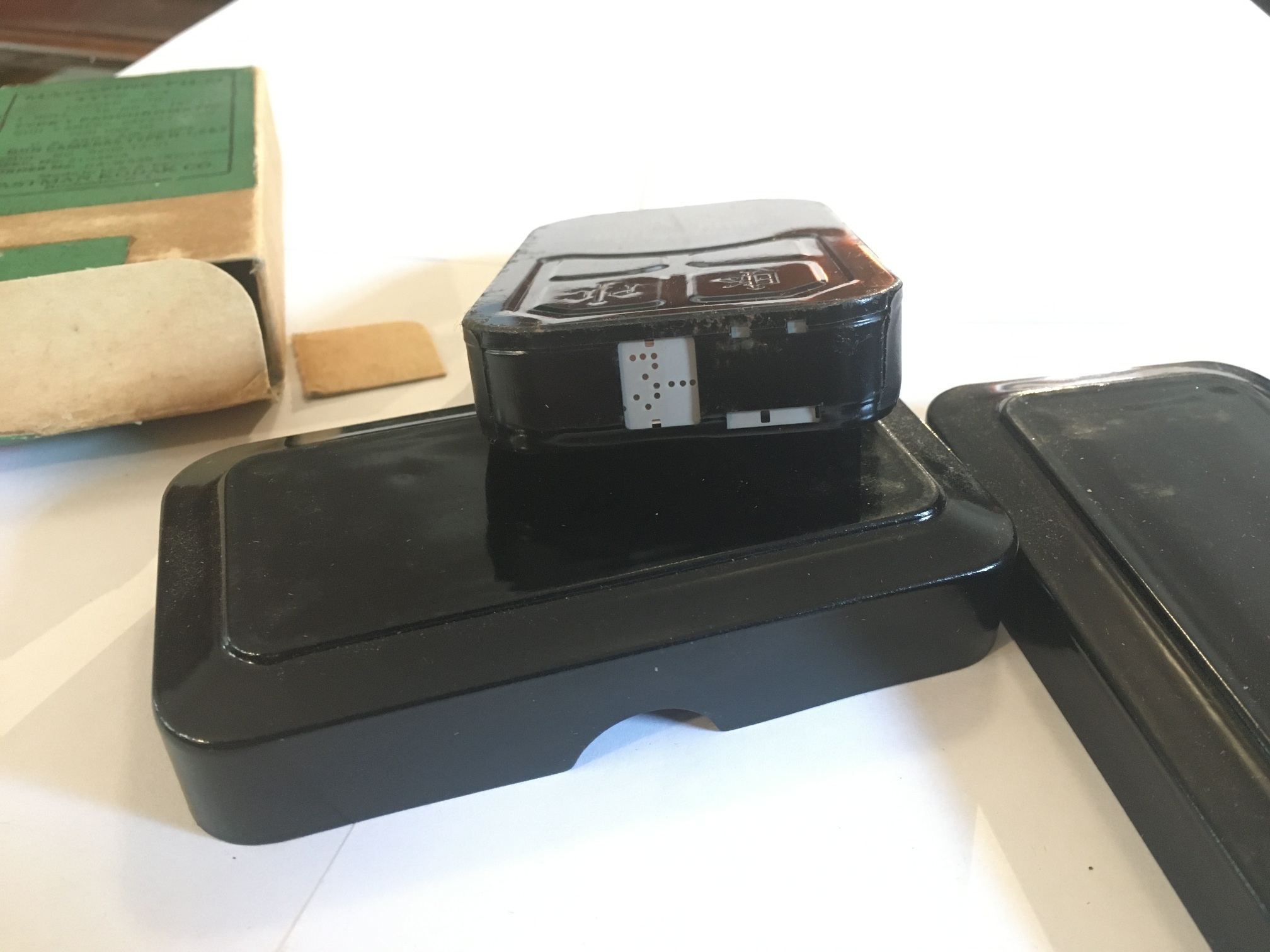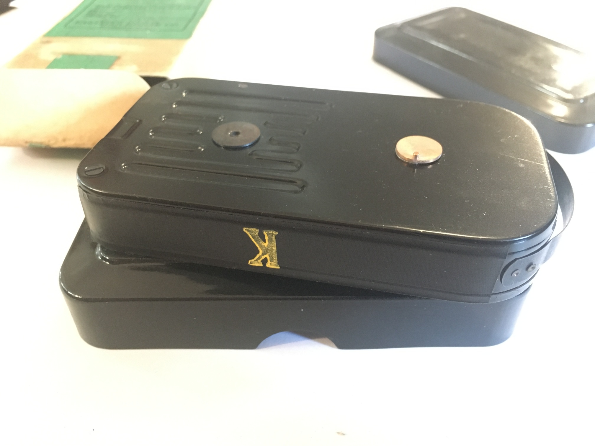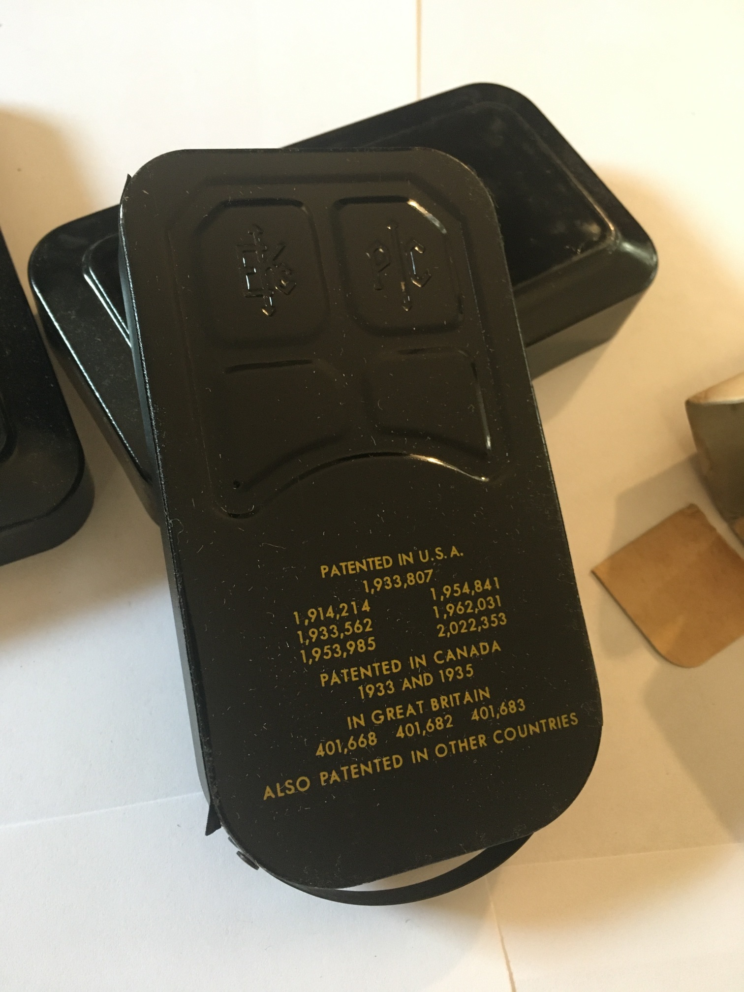 | Description | Cardboard box with green label, containing an unused A-4 film magazine in a stamped steel two part box, similar to a traveling soap-box. The magazine and box are painted black. Label states: "MAGAZINE, FILM | TYPE A-4 | LOADED WITH | 1 ROLL 16 mm x 18 1/2 ft. | TYPE 1 PANCHROMATIC | GUN CAMERA SAFETY FILM | FOR USE IN | U. S. ARMY AIR CORPS | GUN CAMERAS TYPE H-1, 2 & 3 | EMUL. No. 5206-13-01 | SPEC. No. 31038-A | ORDER No. DA-W535 AC-1090 | Made in U. S. A. by | EASTMAN KODAK CO. | Rochester, N. Y.", and is stamped "EXPIRES MAR 1943". Label has a different "EMUL. No." from Magazine, Film, Type A-4, in box, with missing seal, among other less important changes. The label seals one end. The other end had a separate seal, now broken, which is marked "OPEN HERE". The magazine is sealed with black tape, and is printed with information relating to patents (up to 1935, in the U.S.). The logos of Kodak ("EK") and International Projector Corp. ("IP") are stamped into the magazine. See US Patent 2,022,353 (issued 1935). This was likely intended for use in Gun Camera, W-7B (US Type H-3), but the same cartridge, loaded with less film, would have also been used in USN Gun Camera Mark VI Mod. 3 with transit case (and USN Gun Camera, Mark VI, Model 3). |