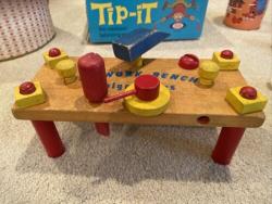 Appears mostly complete, though missing the steel wrench. Except for the hammer, which is nailed together, and the vise handle, it completely disassembles into the following pieces: