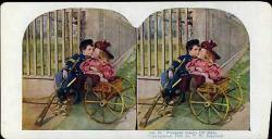 Full-color stereo card, with blue text. Shows a girl and a boy dressed as a soldier, kissing on a small wagon.