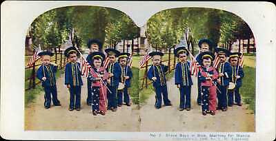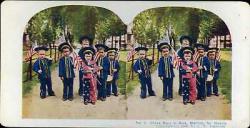Full-color stereo card, with blue text. Shows five boys and a girl, in patriotic attire, with American flags.