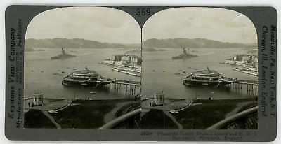 Black and white stereo card, showing HMS Resolution sailing through Plymouth Sound in England. Numbered 28264 near the title, and 359 at the top.