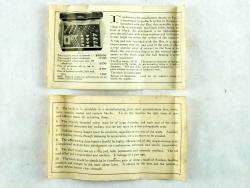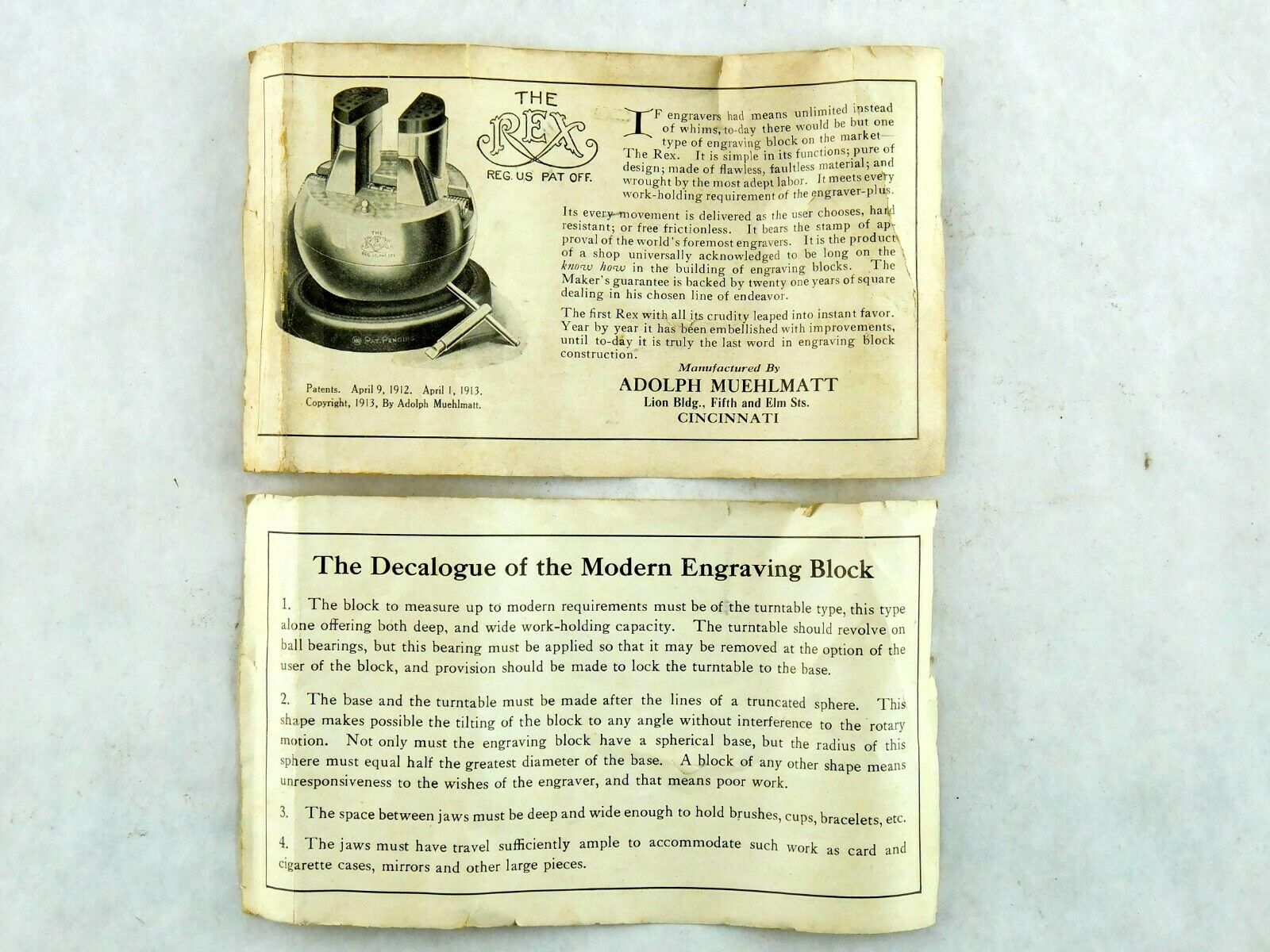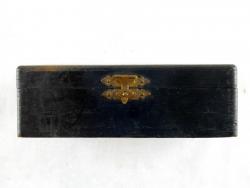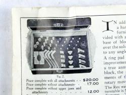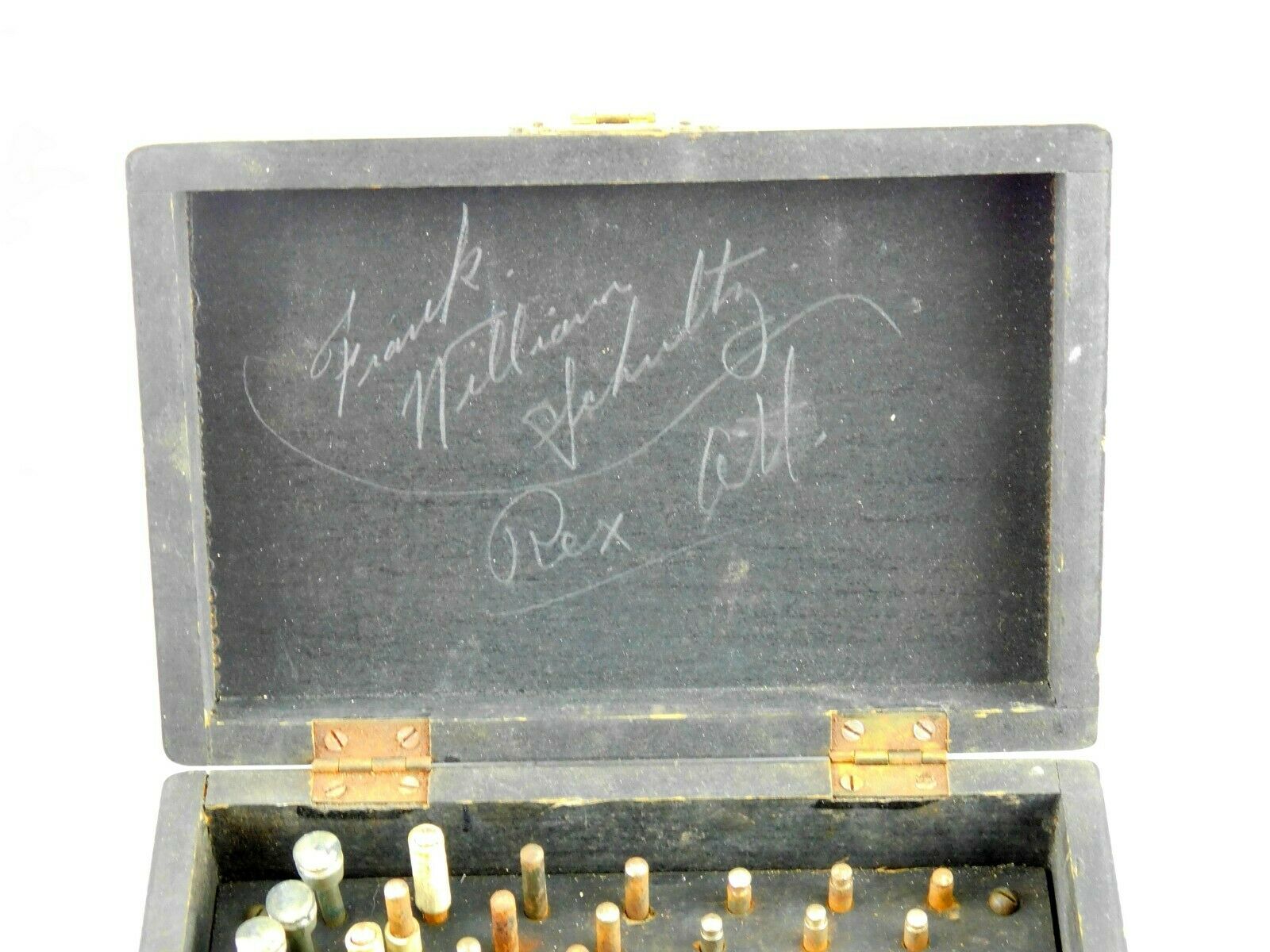 | Description | Small blackened wooden box, containing a set of engraver's ball vise attachments. According to the insert, these were intended for Muehlmatt's "The Rex" vise, though they fit my "The ACME" engraver's ball vise, Adolph Muehlmatt, Cincinnati. Missing six pieces: a pair of small triangles (two others are present), and all four of the large bent rods, which appear to be intended to be used to hold very large objects. Rust on some of the attachments, mostly below the woodline, and on the brass-plated hinges. Includes a small insert describing the use of "The Rex" ball vise and accessories. It includes illustrations of both the vise, and this accessory set. It lists patent dates of 1912 and 1913. Inside the box lid, in pencil, "Frank | William | Schultz | Rex Att.". Interestingly, the original price as stated in the insert was $3, which is almost exactly what I paid for it, after inflation, and before shipping and taxes. |