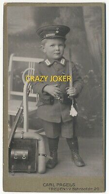 The child wears a peaked cap with German national and state roundels, wears a wool uniform with collar litzen, with a small tri-color flag pin on his chest. Two leather ammo pouches on a leather belt, the buckle obscured by his fingers. He holds an unsheathed sword with knot, the scabbard hanging from his belt. Next to him, up against a chair, are a fur-covered tornister pack with blanket, and an unknown toy rifle. The rifle has significant detail, but does not appear as realistic as the rest of the equipment.