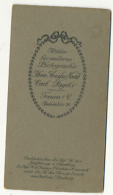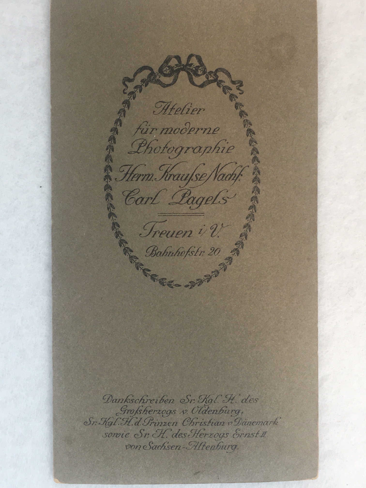On the reverse, in a wreath: "Atelier | für moderne | Photographie | Herm. Krausse Nachs: | Carl Lagels | Treuen i/V. | Bahnhofstr. 20". Below that, "Dankschreiben Sr. Kgl. des | Grossherzogs v. Oldenburg, | Sr. Kgl. H. d. Prinzen Christian v. Dänemark | sowie Sr. H. des Herzogs Ernst II | von Sachsen-Altenburg.". |