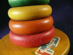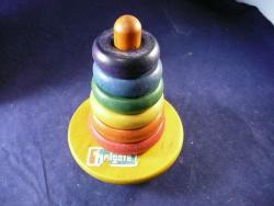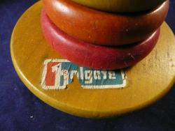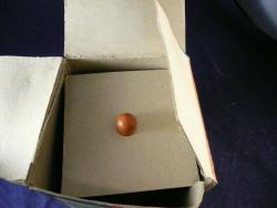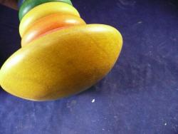 | Description | Appears to be an unused Rocky Color Cone, the only one I've seen with Type 6 decal (dt6). Decal is dry and loose, and will require conservation. Compare to Holgate #1107 "Rocky Color Cone", late, of the same era. This one has a less glossy finish, looking more like milk paint. The base appears to be lightly dyed yellow, with a thin orange paint on the center shaft. The box is complete, but glued edge has separated. It has a 1948 copyright. I currently believe this decal indicates it's several years after that, but more research is needed. |