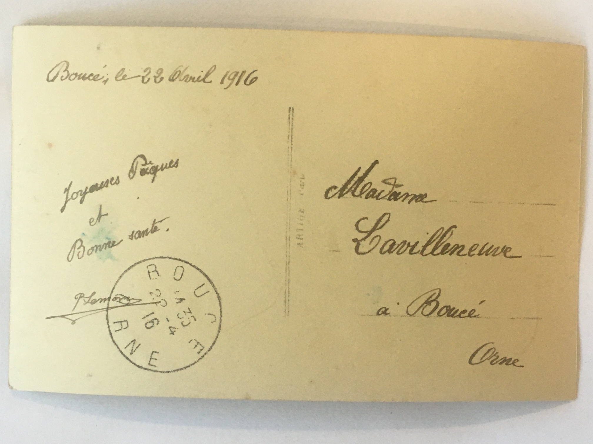 Cancelled French green 5c stamp on obverse. Writing and second postmark on back clearly dated 1916. Divided-back. |
