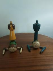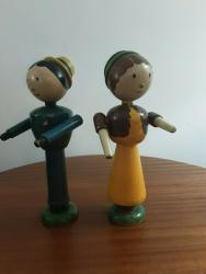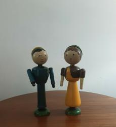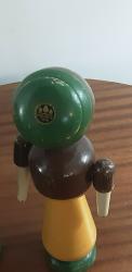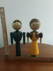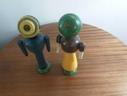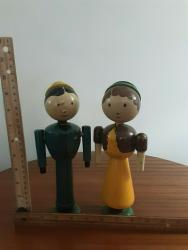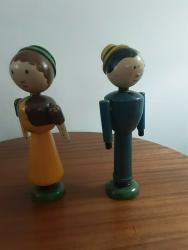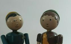| Description | Holgate figures introduced in 1937, and not found in the 1938 catalog. Hand-painted Betty with removable/movable head and arms. Hand-painted orange dress with brown top and green bow, and a green hat with a gilt pre-USA decal (dt4b) on the back of the head. Billy has a little hat with the same decal. | |