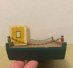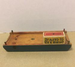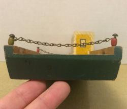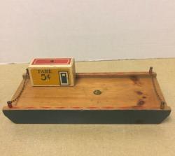 | Description | Auto ferry in very good condition, but missing the Kilgore Jewels for Playthings plastic cars, which originally came with it. Both front and rear chains and hooks are intact. Decal type 4b (dt4b) on center of deck, with slight damage. Parts and printing match the 1939-1941 catalogs, although the assembly only matches 1941. Printing changed in 1941, and the chain was replaced with string after that. |