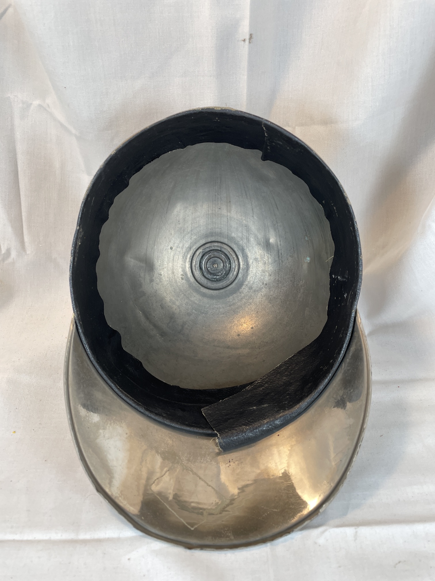 A plain stamped helmet, with neck guard and screw-on finial. Nickel plated.
