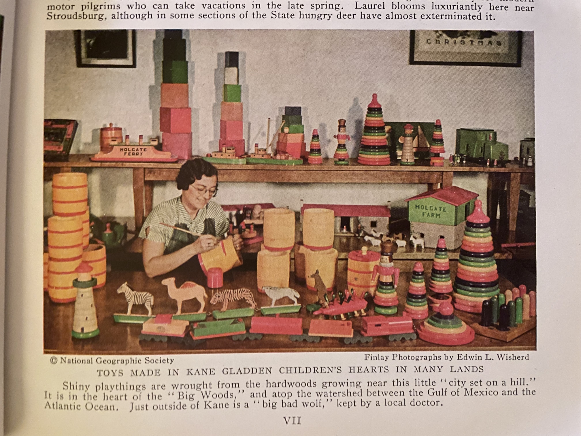 Page 19 (Plate VII) has a color photo of a woman surrounded by Holgate toys. |