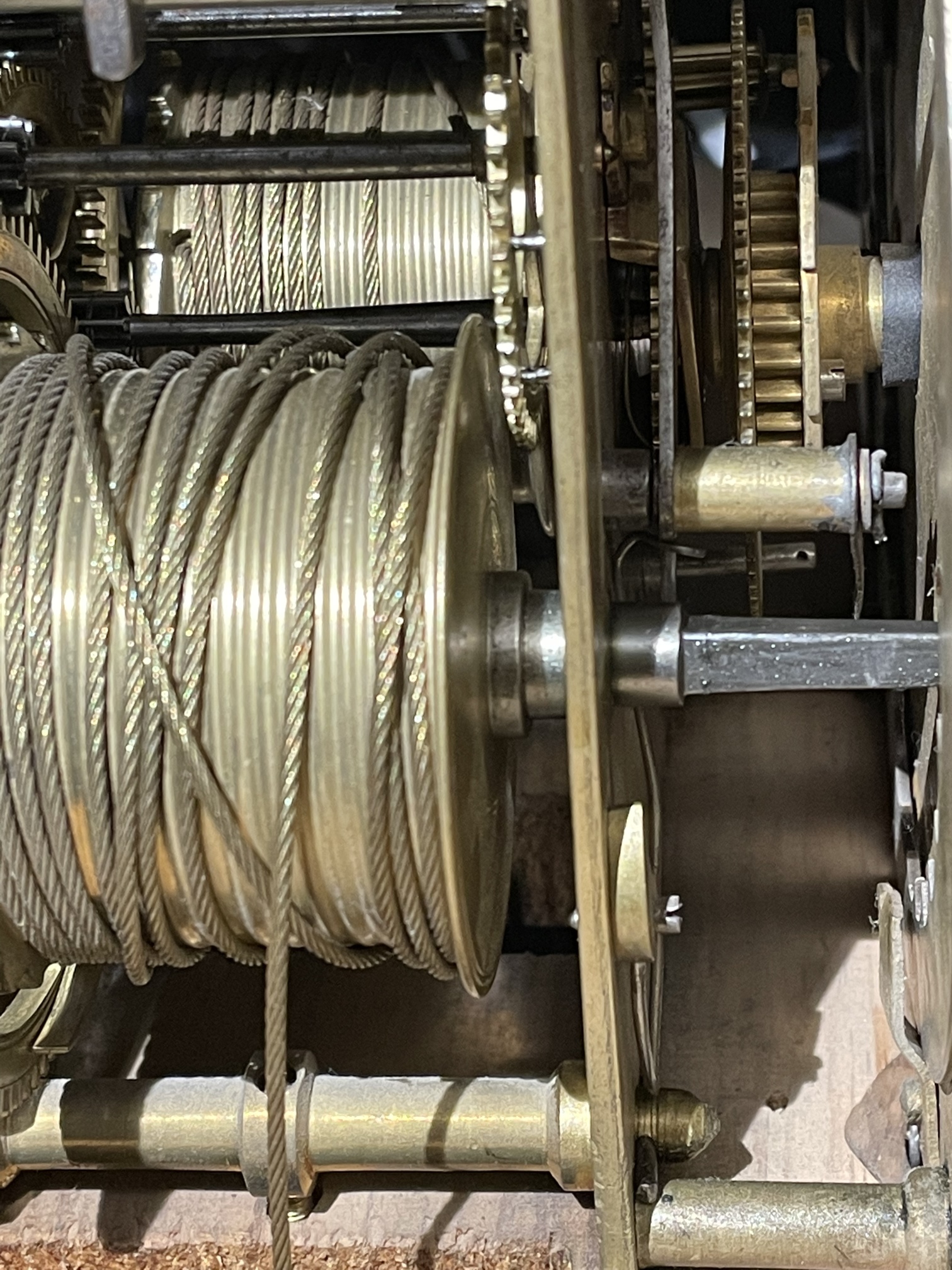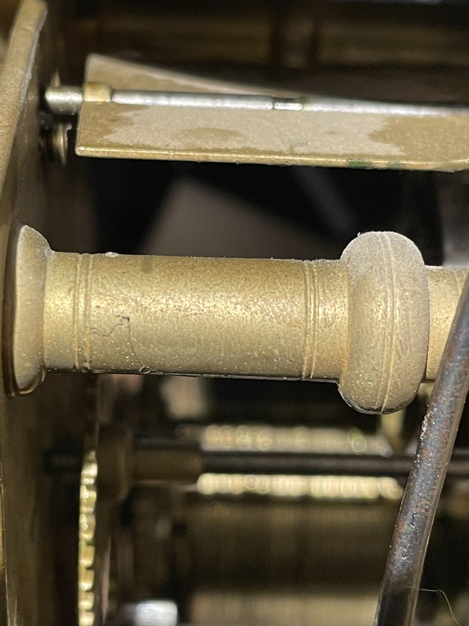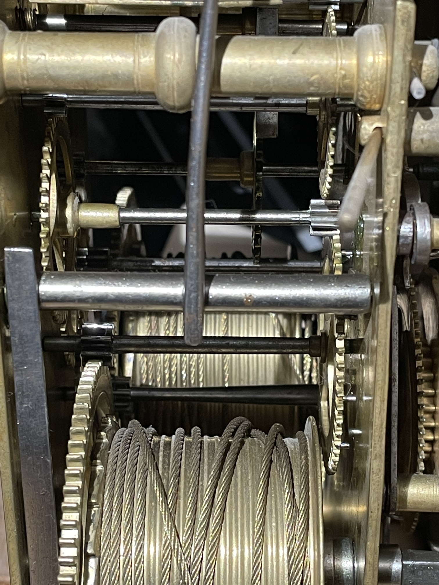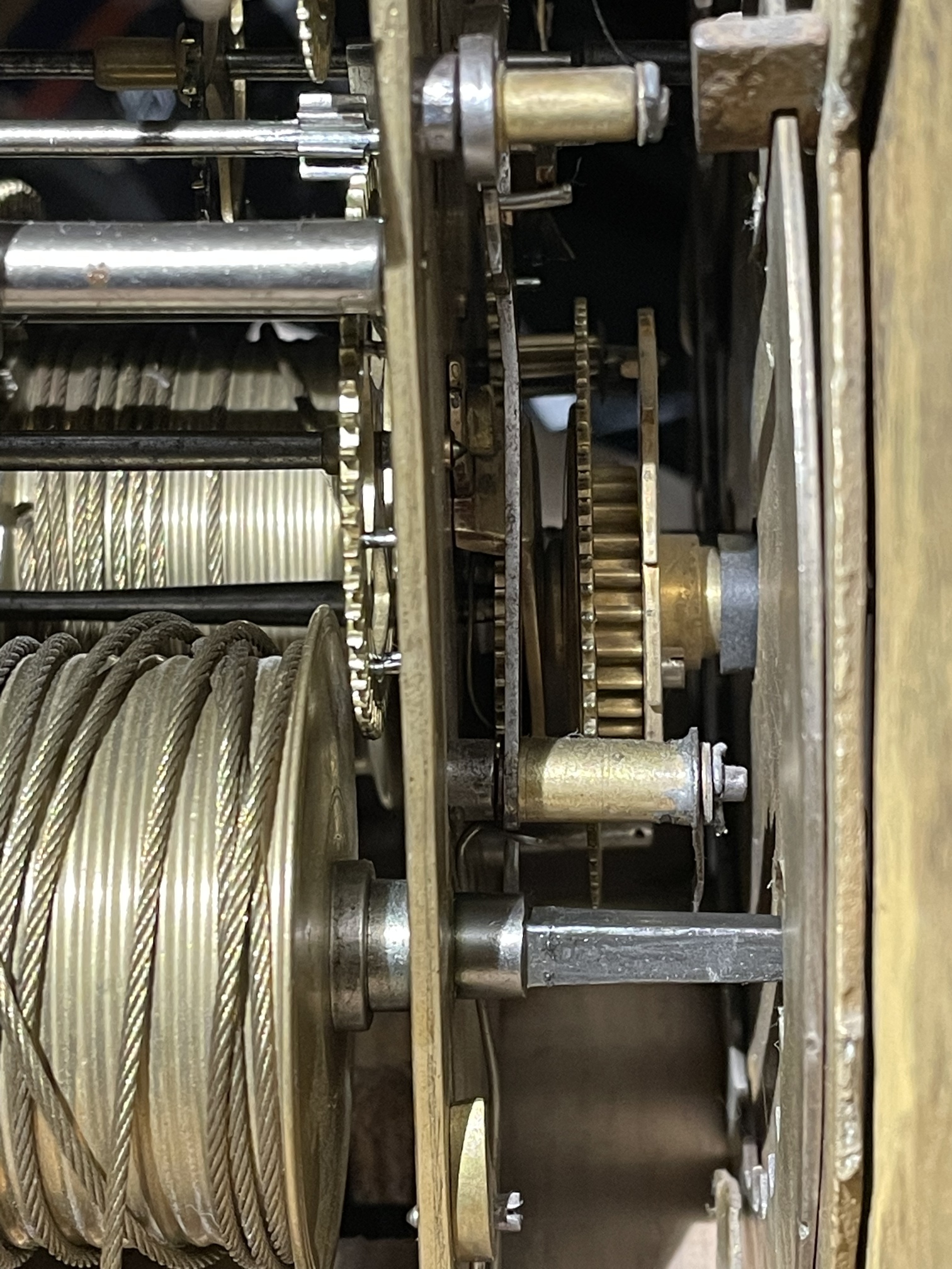 | Description | Irish longcase clock with 13 1/2" square brass dial (hands likely replaced). Dial is signed "Edm'd Sturgys | DUBLIN", at the bottom of the chapter ring. Silvered chapter ring has roman numerals for hours, and minutes numbered every 5 minutes. Half hours are marked with a fleur-de-lis, and half-quarters are marked with a "*". Twin cherub with crown spandrels (Loomes p.32 #4), in use until 1725. Matted dial center has a silvered seconds ring, marked on the 10s, and marked with a "*" for the 5s, two winding holes, and a circular calendar window, showing a silvered calendar dial behind. Engraved pattern to edge of dial center. Similar engraving around dial plate, outside the chapter ring. Movement is an 8-day, anchor escapement, with 5 pairs of incised lines on each of the four pillars (see Loomes, p.37, #6, "provincial [...] unlikely [...] after about 1760"). The lower left pillar is a replacement, as is the screw holding it to the wood. Calendar ring does not have anything driving it, and is held by three supports of three different types: a brass pulley (original?), an iron bracket, and a brass bracket (appears newest). Steel post with pinhole at top appears to be for the calendar wheel, appears bent. There are several spurious holes: two small holes through the front plate behind the going barrel, and a large threaded hole two inches above it. Also, a very small hole through the bottom center of at least the back plate. The dial pillar above the going barrel broke at the pin, and a new pin hole was drilled through the edge of the plate. Movement has been heavily oiled (improperly, including on the anchor pallets). All small pivot holes have been bushed. The barrel pivot holes have not been, and are very loose. The mahogany case includes a flat-top hood with fretwork at top. Hidden remains of more fretwork, along with spurious screw holes to top, raise questions about modifications. Long trunk and door, with short base, is typical of Dublin clocks (Loomes, p.287). See very similar clock by Philip Glasco, Dublin, circa 1730, shown in "300 Years of Irish Timekeeping", by Chellar & Chellar. There are two notes pasted inside. The first, pasted on the inside of the left panel of the case, appears to be a receipt. It has "No. C298090" printed at the top. A floral pattern is along the right edge. Below the number, "22 Dec. 1888." is hand-written. Below that, it says "John Willoughby - | (watchmaker Kilkenny) | £5 | for old grandfather | clock". The Kilkenny Archives hold Willoughby's papers. It will be interesting to see if a match is found. It's also interesting that, after inflation, the price in 1888 only slightly less than what I paid. The second note states, on letterhead from "ANDY POTTER": "PURCHASED BY A.J.+ J.W.POTTER | CLOCK PURCHASED IN GALWAY, | IRELAND SEPTEMBER 1972 + | SHIPPED TO LONG BEACH, CALIF. | ARRIVING IN EARLY 1973. REPAIRED | BY CALIFORNIA TIME SERVICE | APRIL 28, 1973 COST TO REPAIR $154.80." Edmond Sturgys was warden of the Goldsmith's Company of Dublin in 1720-1723, and master in 1728-1729. He is listed as a watchmaker, before 1729, in "Watchmakers and Clockmakers of the World", G.H. Baillie, as "Edmund Sturgis". He died "on Summer-hill" on 2 November, 1751, and was listed as "a noted Watchmaker" in his death announcement (spelled "Edmund Sturgys"). References to Loomes are to "Grandfather Clocks and their Cases", Brian Loomes. |