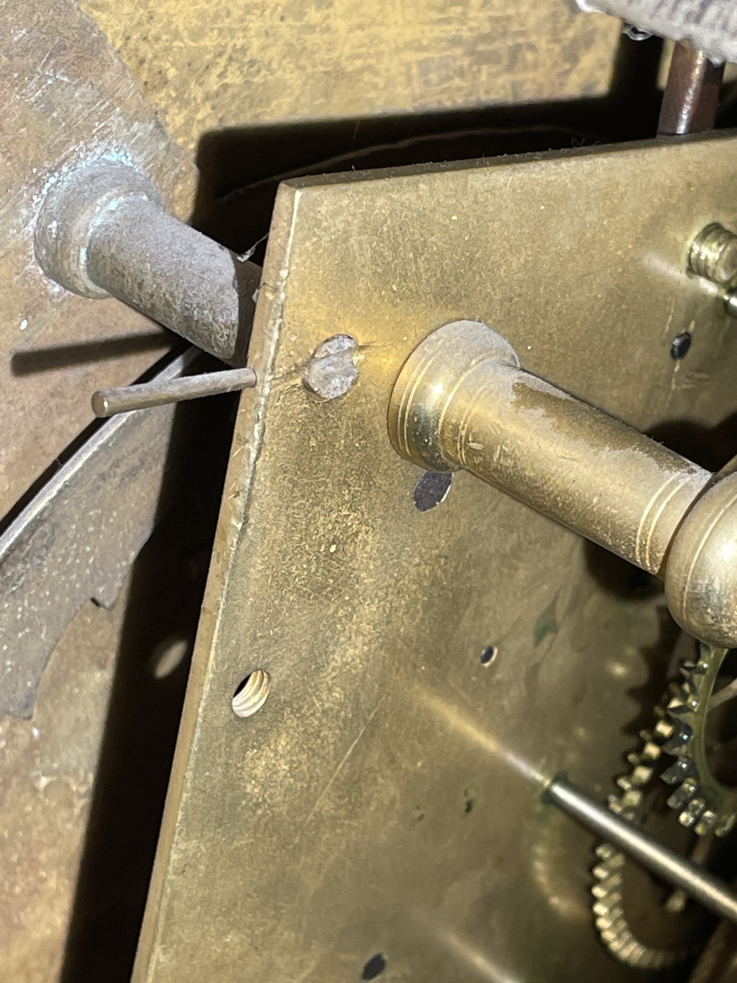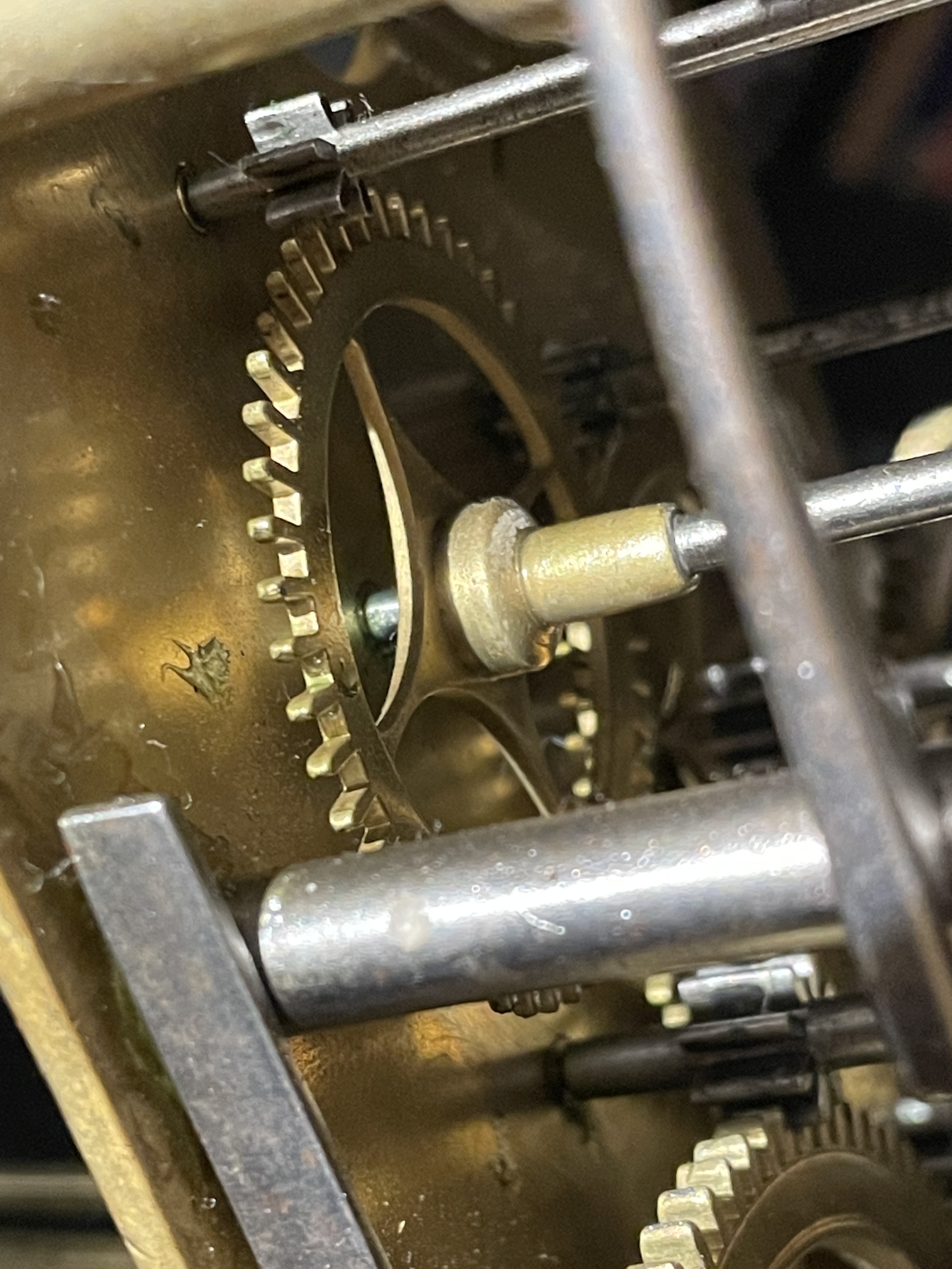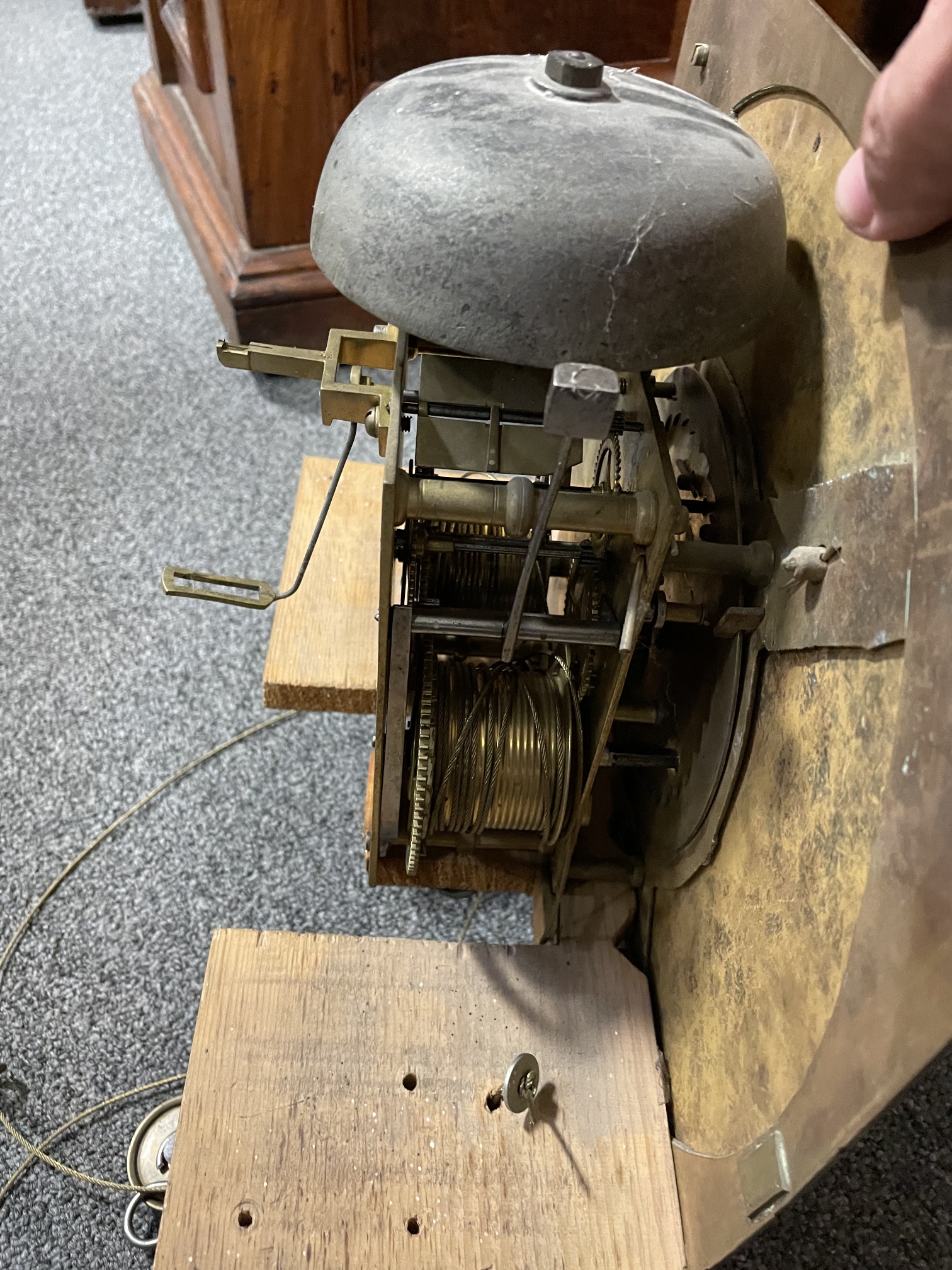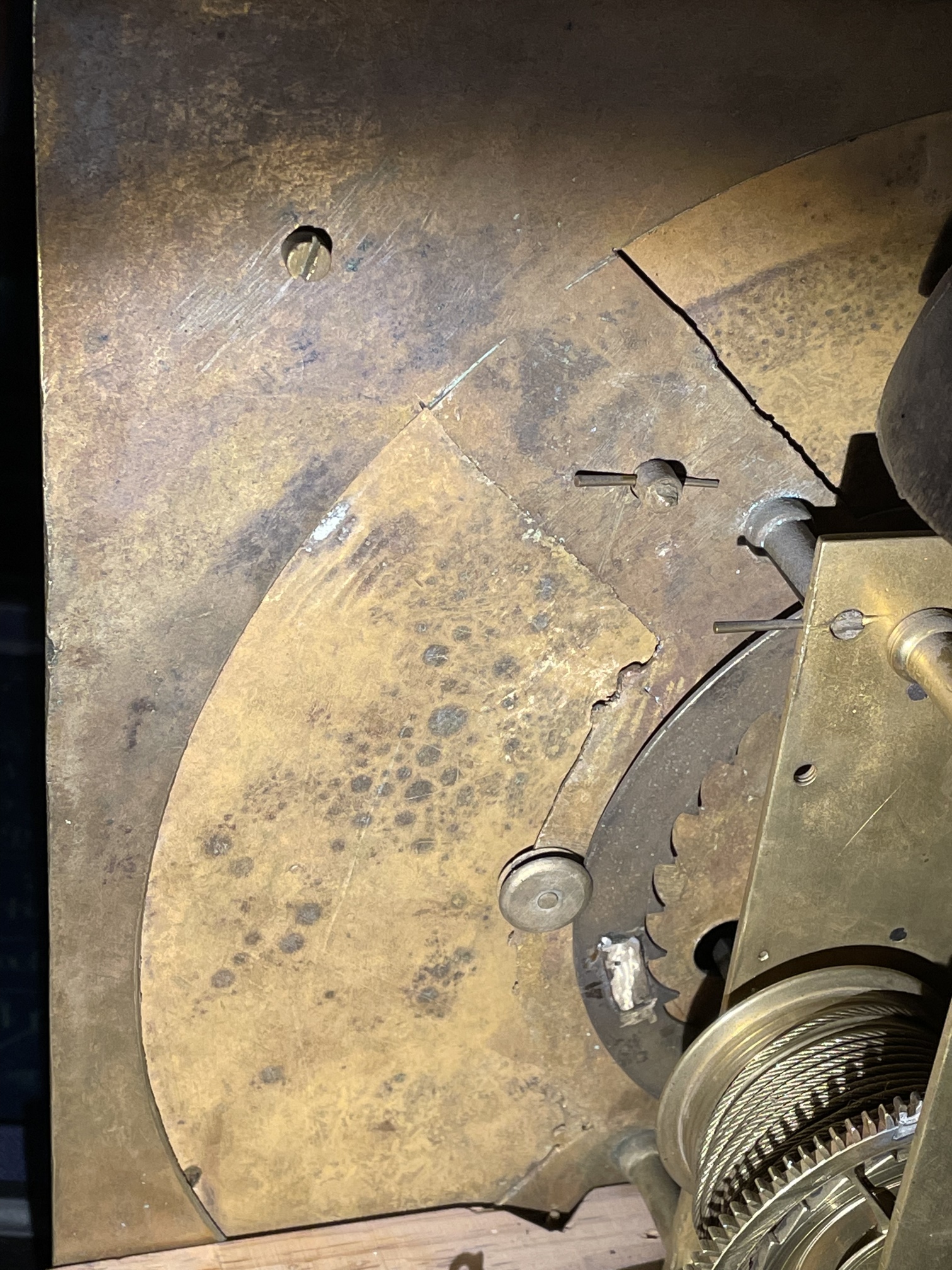 | Description | Irish longcase clock with 13 1/2" square brass dial (hands likely replaced). Dial is signed "Edm'd Sturgys | DUBLIN", at the bottom of the chapter ring. Silvered chapter ring has roman numerals for hours, and minutes numbered every 5 minutes. Half hours are marked with a fleur-de-lis, and half-quarters are marked with a "*". Twin cherub with crown spandrels (Loomes p.32 #4), in use until 1725. Matted dial center has a silvered seconds ring, marked on the 10s, and marked with a "*" for the 5s, two winding holes, and a circular calendar window, showing a silvered calendar dial behind. Engraved pattern to edge of dial center. Similar engraving around dial plate, outside the chapter ring. Movement is an 8-day, anchor escapement, with 5 pairs of incised lines on each of the four pillars (see Loomes, p.37, #6, "provincial [...] unlikely [...] after about 1760"). The lower left pillar is a replacement, as is the screw holding it to the wood. Calendar ring does not have anything driving it, and is held by three supports of three different types: a brass pulley (original?), an iron bracket, and a brass bracket (appears newest). Steel post with pinhole at top appears to be for the calendar wheel, appears bent. There are several spurious holes: two small holes through the front plate behind the going barrel, and a large threaded hole two inches above it. Also, a very small hole through the bottom center of at least the back plate. The dial pillar above the going barrel broke at the pin, and a new pin hole was drilled through the edge of the plate. Movement has been heavily oiled (improperly, including on the anchor pallets). All small pivot holes have been bushed. The barrel pivot holes have not been, and are very loose. The mahogany case includes a flat-top hood with fretwork at top. Hidden remains of more fretwork, along with spurious screw holes to top, raise questions about modifications. Long trunk and door, with short base, is typical of Dublin clocks (Loomes, p.287). See very similar clock by Philip Glasco, Dublin, circa 1730, shown in "300 Years of Irish Timekeeping", by Chellar & Chellar. There are two notes pasted inside. The first, pasted on the inside of the left panel of the case, appears to be a receipt. It has "No. C298090" printed at the top. A floral pattern is along the right edge. Below the number, "22 Dec. 1888." is hand-written. Below that, it says "John Willoughby - | (watchmaker Kilkenny) | £5 | for old grandfather | clock". The Kilkenny Archives hold Willoughby's papers. It will be interesting to see if a match is found. It's also interesting that, after inflation, the price in 1888 only slightly less than what I paid. The second note states, on letterhead from "ANDY POTTER": "PURCHASED BY A.J.+ J.W.POTTER | CLOCK PURCHASED IN GALWAY, | IRELAND SEPTEMBER 1972 + | SHIPPED TO LONG BEACH, CALIF. | ARRIVING IN EARLY 1973. REPAIRED | BY CALIFORNIA TIME SERVICE | APRIL 28, 1973 COST TO REPAIR $154.80." Edmond Sturgys was warden of the Goldsmith's Company of Dublin in 1720-1723, and master in 1728-1729. He is listed as a watchmaker, before 1729, in "Watchmakers and Clockmakers of the World", G.H. Baillie, as "Edmund Sturgis". He died "on Summer-hill" on 2 November, 1751, and was listed as "a noted Watchmaker" in his death announcement (spelled "Edmund Sturgys"). References to Loomes are to "Grandfather Clocks and their Cases", Brian Loomes. |