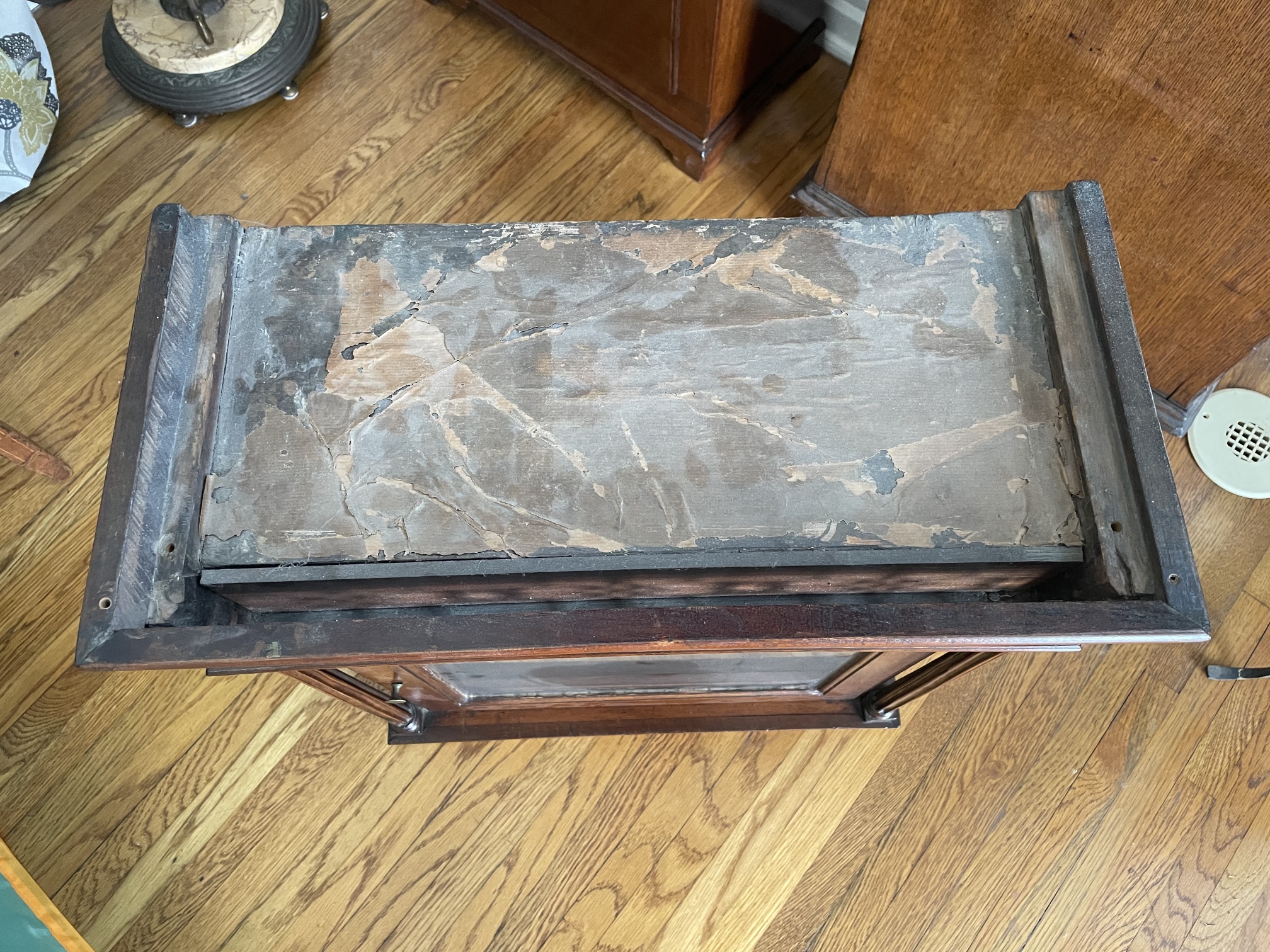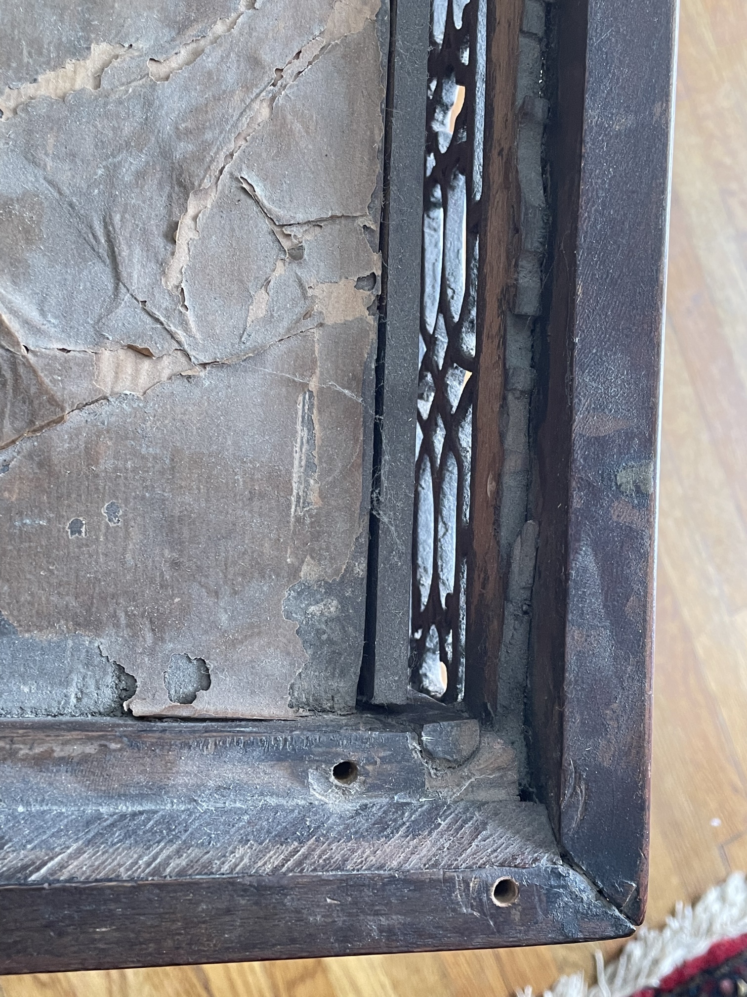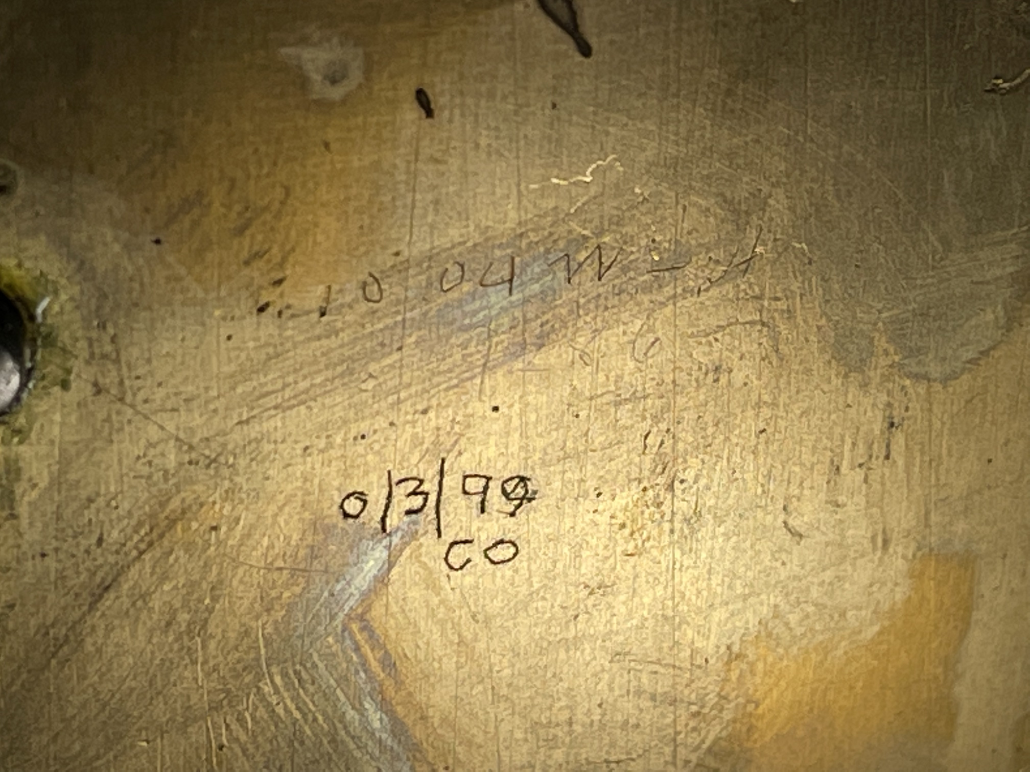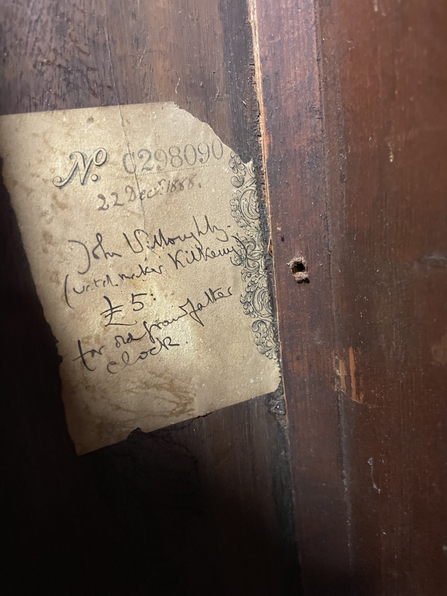 | Description | Irish longcase clock with 13 1/2" square brass dial (hands likely replaced). Dial is signed "Edm'd Sturgys | DUBLIN", at the bottom of the chapter ring. Silvered chapter ring has roman numerals for hours, and minutes numbered every 5 minutes. Half hours are marked with a fleur-de-lis, and half-quarters are marked with a "*". Twin cherub with crown spandrels (Loomes p.32 #4), in use until 1725. Matted dial center has a silvered seconds ring, marked on the 10s, and marked with a "*" for the 5s, two winding holes, and a circular calendar window, showing a silvered calendar dial behind. Engraved pattern to edge of dial center. Similar engraving around dial plate, outside the chapter ring. Movement is an 8-day, anchor escapement, with 5 pairs of incised lines on each of the four pillars (see Loomes, p.37, #6, "provincial [...] unlikely [...] after about 1760"). The lower left pillar is a replacement, as is the screw holding it to the wood. Calendar ring does not have anything driving it, and is held by three supports of three different types: a brass pulley (original?), an iron bracket, and a brass bracket (appears newest). Steel post with pinhole at top appears to be for the calendar wheel, appears bent. There are several spurious holes: two small holes through the front plate behind the going barrel, and a large threaded hole two inches above it. Also, a very small hole through the bottom center of at least the back plate. The dial pillar above the going barrel broke at the pin, and a new pin hole was drilled through the edge of the plate. Movement has been heavily oiled (improperly, including on the anchor pallets). All small pivot holes have been bushed. The barrel pivot holes have not been, and are very loose. The mahogany case includes a flat-top hood with fretwork at top. Hidden remains of more fretwork, along with spurious screw holes to top, raise questions about modifications. Long trunk and door, with short base, is typical of Dublin clocks (Loomes, p.287). See very similar clock by Philip Glasco, Dublin, circa 1730, shown in "300 Years of Irish Timekeeping", by Chellar & Chellar. There are two notes pasted inside. The first, pasted on the inside of the left panel of the case, appears to be a receipt. It has "No. C298090" printed at the top. A floral pattern is along the right edge. Below the number, "22 Dec. 1888." is hand-written. Below that, it says "John Willoughby - | (watchmaker Kilkenny) | £5 | for old grandfather | clock". The Kilkenny Archives hold Willoughby's papers. It will be interesting to see if a match is found. It's also interesting that, after inflation, the price in 1888 only slightly less than what I paid. The second note states, on letterhead from "ANDY POTTER": "PURCHASED BY A.J.+ J.W.POTTER | CLOCK PURCHASED IN GALWAY, | IRELAND SEPTEMBER 1972 + | SHIPPED TO LONG BEACH, CALIF. | ARRIVING IN EARLY 1973. REPAIRED | BY CALIFORNIA TIME SERVICE | APRIL 28, 1973 COST TO REPAIR $154.80." Edmond Sturgys was warden of the Goldsmith's Company of Dublin in 1720-1723, and master in 1728-1729. He is listed as a watchmaker, before 1729, in "Watchmakers and Clockmakers of the World", G.H. Baillie, as "Edmund Sturgis". He died "on Summer-hill" on 2 November, 1751, and was listed as "a noted Watchmaker" in his death announcement (spelled "Edmund Sturgys"). References to Loomes are to "Grandfather Clocks and their Cases", Brian Loomes. |