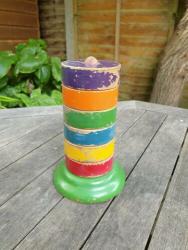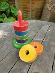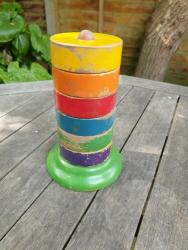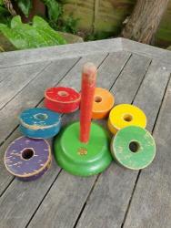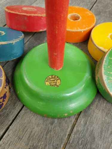| Description | Early stacking toy, with six colored flat-edge rings, on a red post attached to a green base. Base has 85% of a type 3 decal (dt3). Some wear to the rings and post. Base has little wear. |