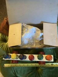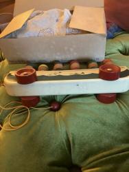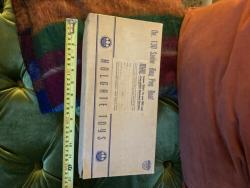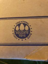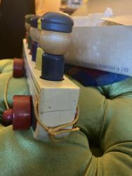 | Description | Mint condition Sailor Peg Boat. No decal. Sailors are comprised of a colored tube, a head with a hole in it, and a colored hat, which has an unpainted peg to go through the other two pieces. (This was changed in 1951, the second year of the 4-sailor boat, to include the peg on the bottom of the head). Dating: the tissue paper used is the same as in Holgate #1003 "Wheel Peg", Type II, with box and Holgate #5137 "Streamliner Choo Choo", new in box, which have been dated to 1946 and 1948, respectively. The box is also similar, though printed in blue, instead of red. The boat decoration, with three thin lines above the waves, and "holgate" on one side, "130" on the other, appears to date it between 1945 and 1946 in the catalogs. The sailors were reduced from six to four in 1950. Un-reinforced manila cardboard box, printed in blue. Left flap marked "COOPER | PAPER | BOX CORP | BUFFALO", with the "C" surrounding the rest, with "OOPER" as the bottom leg. Box has "STUDIED AND COMMENDED PARENTS' MAGAZINE CONSUMER SERVICE BUREAU" logo on top right. |