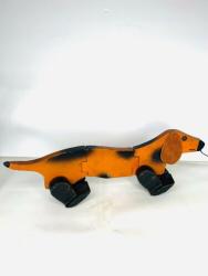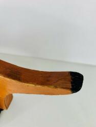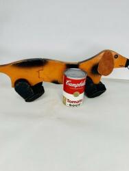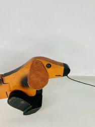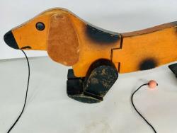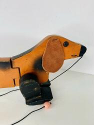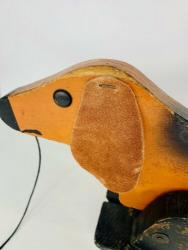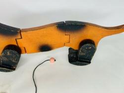 The most noticeable differences are in the wood used. While all other known Holgate-produced Walking Animals are of 3/4" thick wood (including the bunny?), with hardwood feet, this dachshund's body is slightly thinner (need to properly measure), and the feet appear to be pine. The pull-string is also unlike any Holgate pull-strings, and the pull-string ball is actually a small wooden bead painted pink, with a face. A phantom hole seems to indicate the existence of an earlier pull-string.