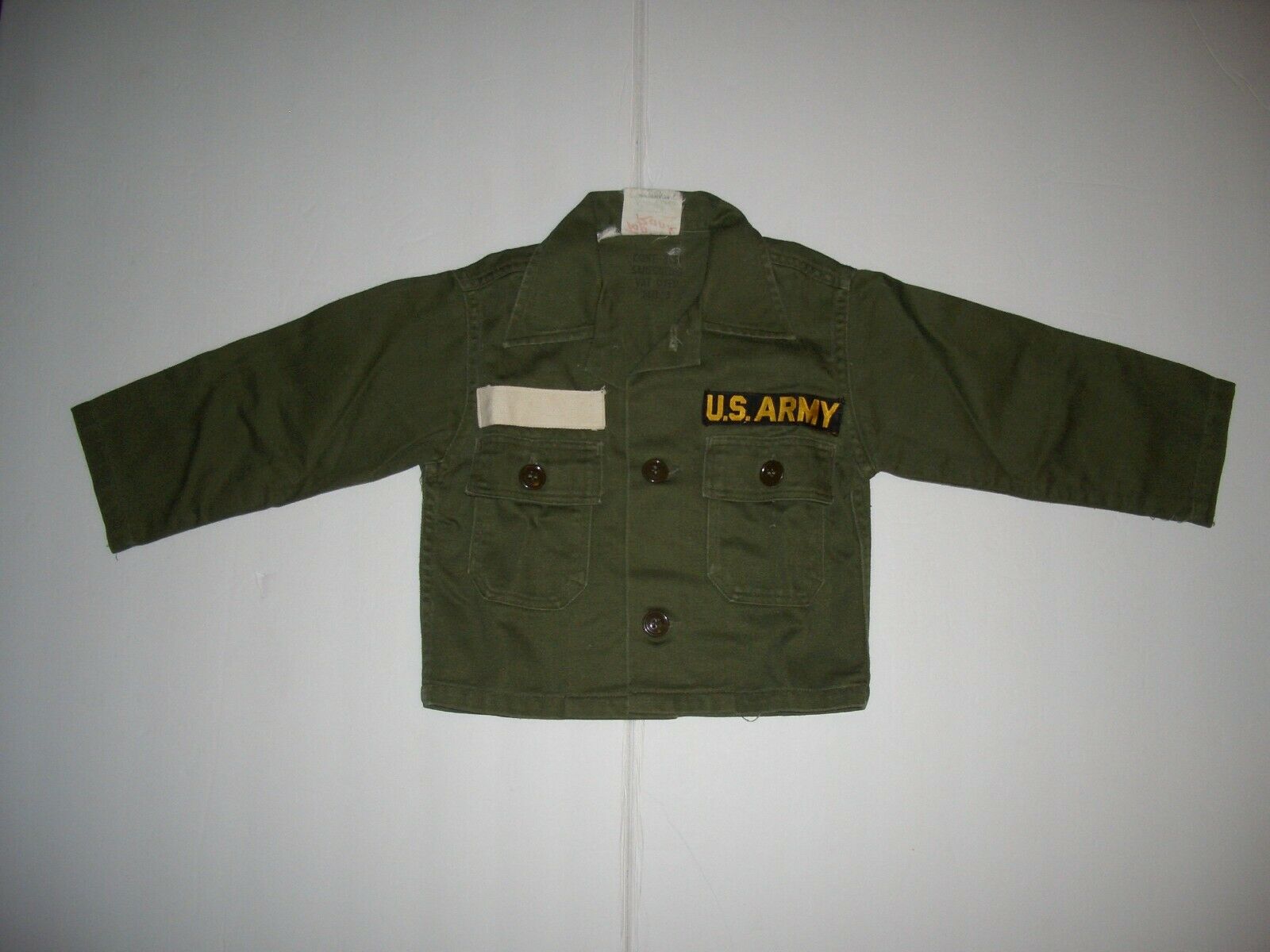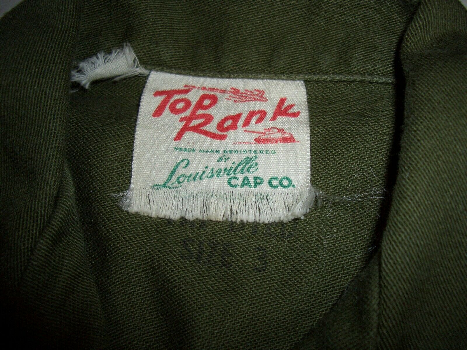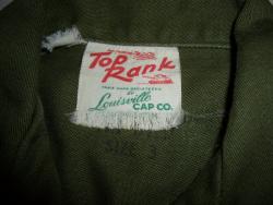 The two-pocket shirt has a three-button front, gold-on-black woven U.S. Army tape, and blank white woven nametape. The neck is stamped "CONT. 8951 | SANFORIZED | VAT DYED | SIZE 3", and a frayed white label: "Top Rank | TRADE MARK REGISTERED | BY | LOUISVILLE CAP CO".