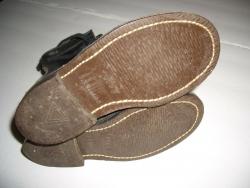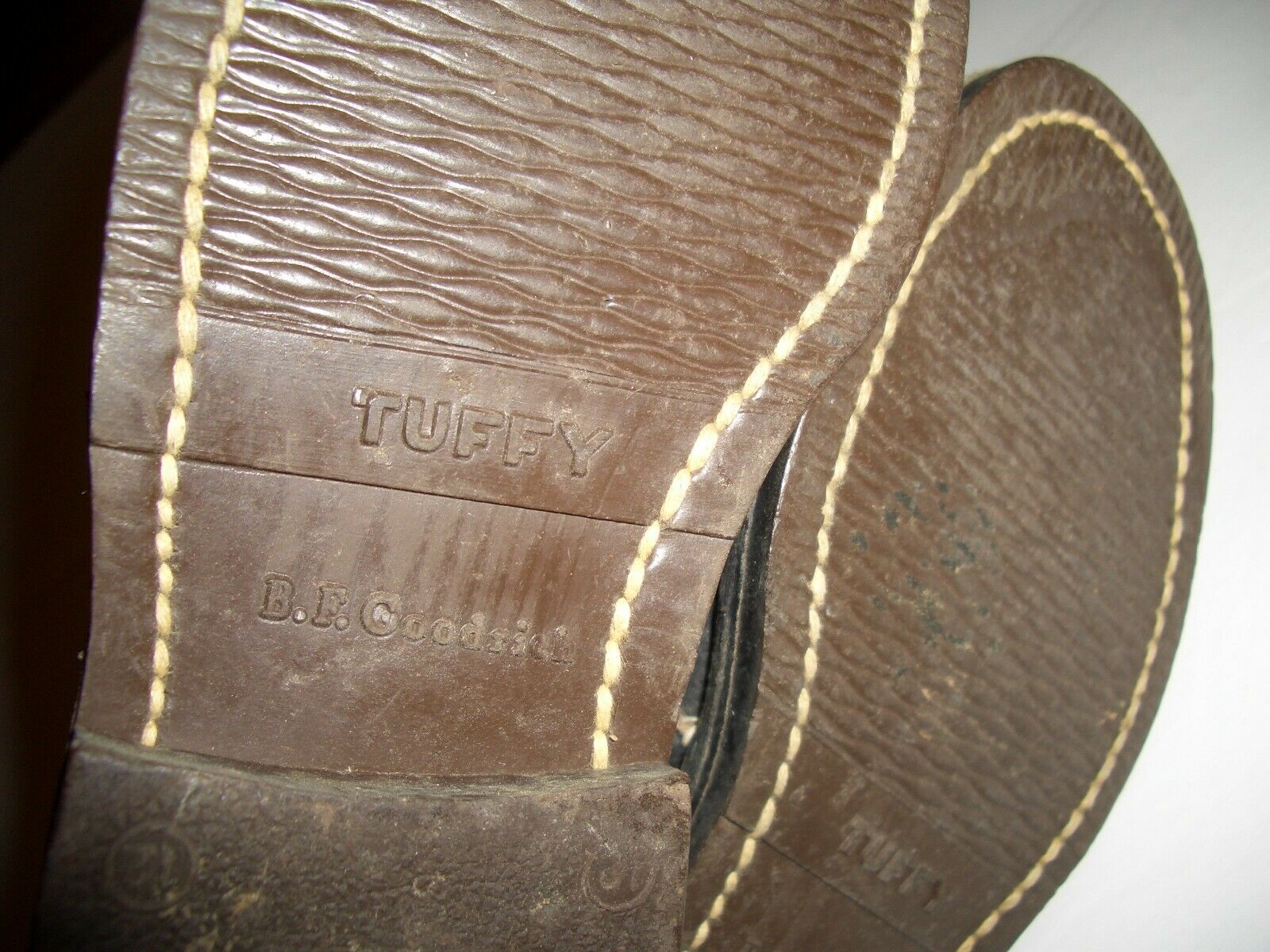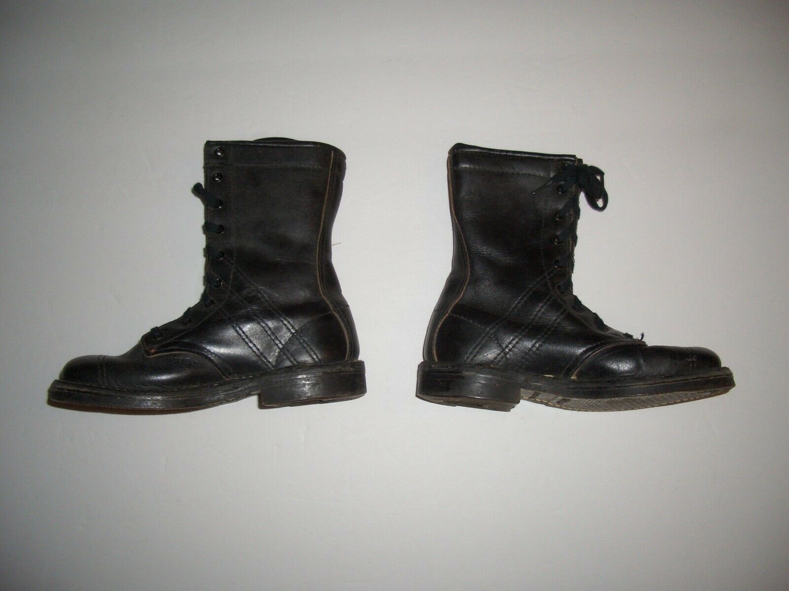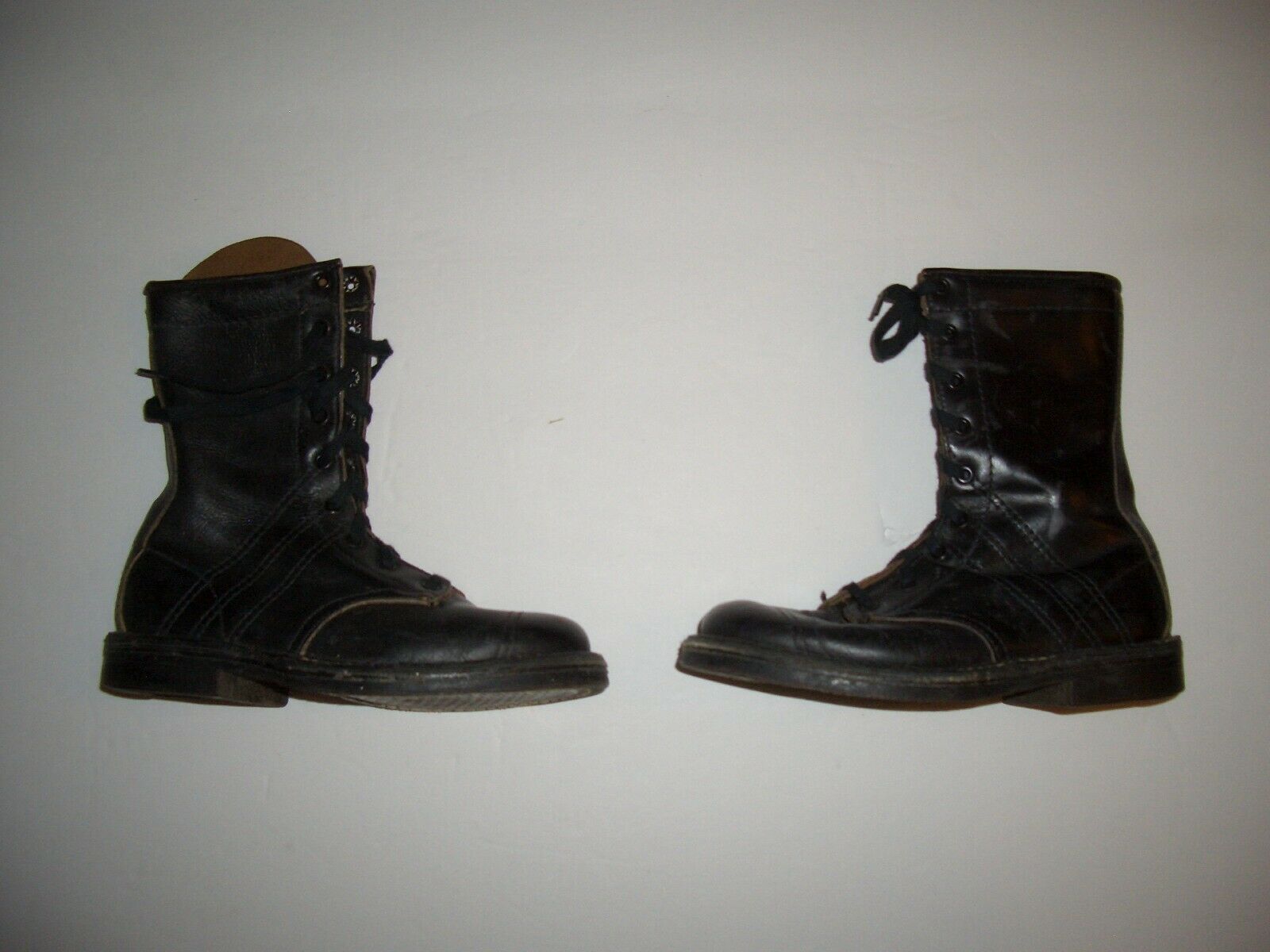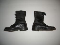 The boots are black leather, and are very well constructed, sewn and reinforced with copper rivets. Nine pairs of eyelets, and black laces. Rubber B.F. Goodrich "TUFFY" soles. The heal lining is stamped "CHAMP | PARATROOPER BOOT". No size stamp is apparent on the leather, but the heels are marked with "12" in a circle.