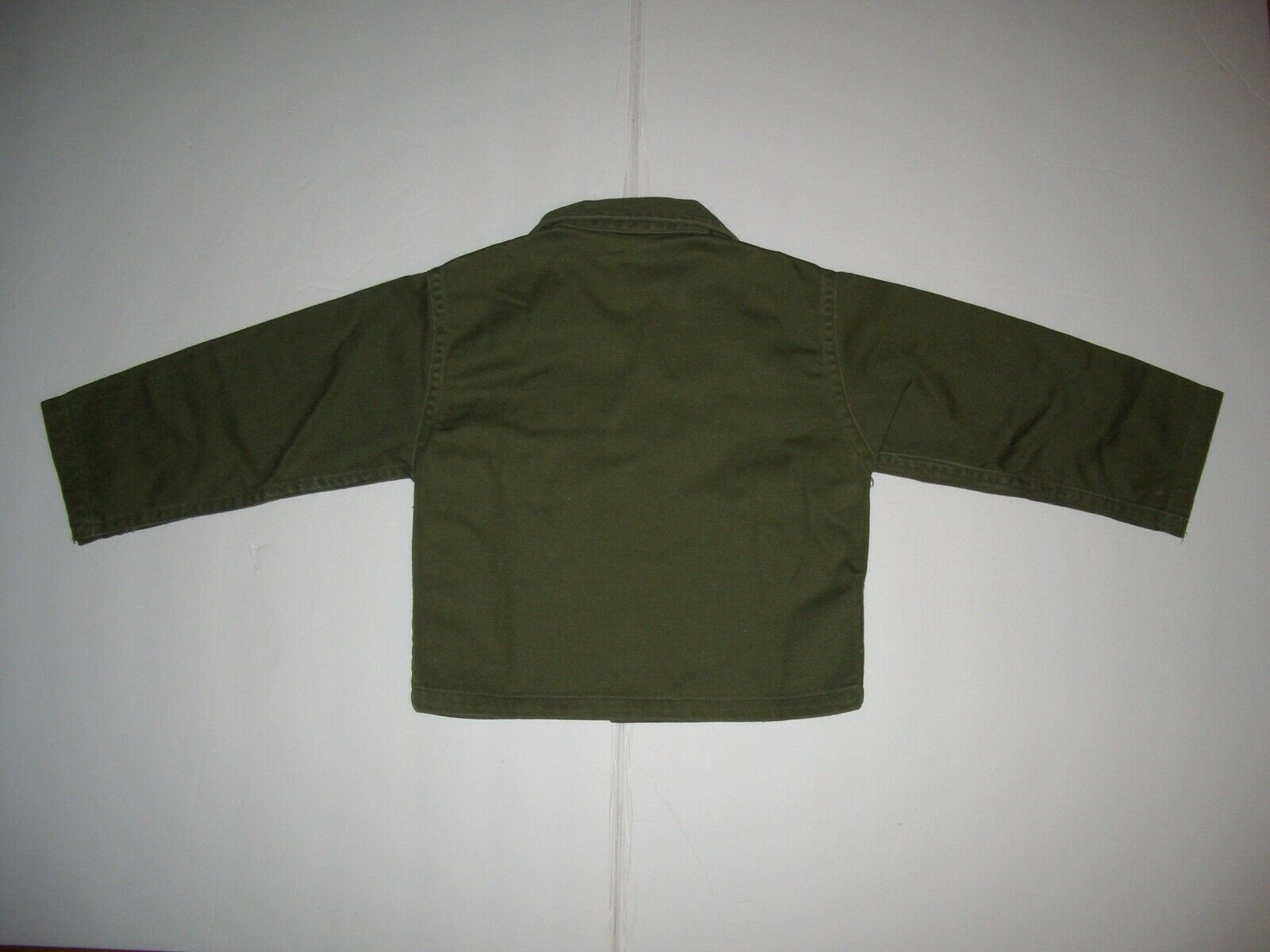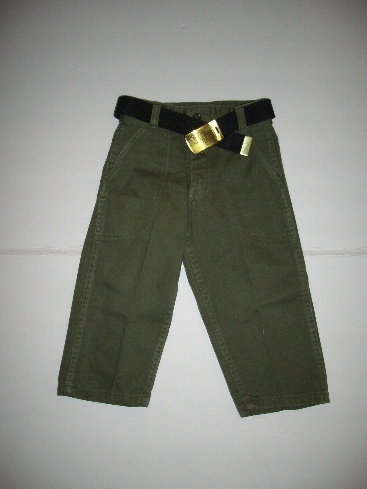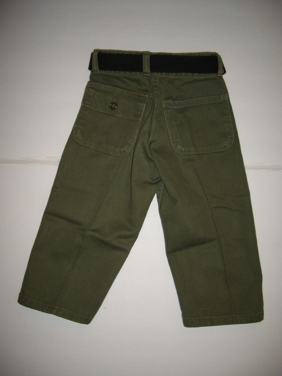 The trousers are thick cotton, and don't appear to be marked. There are four pockets (one flapped), and a zipper fly with one green plastic button.