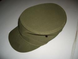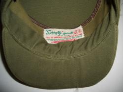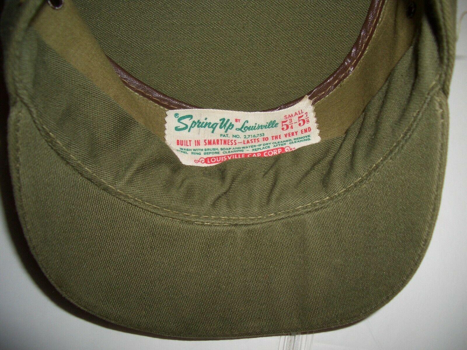 The cap is a Lousville "Spring-Up" cap, also known as a "Ridgeway cap." It has the original Louisville tag, and is size Small, 5 3/4 - 5 7/8. It appears too small for even a three-year-old. It has little wear, but is slightly misshapen from storage. The label says: "(R)SpringUp by Louisville SMALL | 5 3/4 - 5 7/8 | PAT. NO. 2,716,753 | BUILT IN SMARTNESS - LASTS TO THE VERY END | WASH WITH BRUSH, SOAP AND WATER-IF DRY CLEANED, REMOVE | STEEL RING BEFORE CLEANING - REPLACE AFTER CLEANING. | LOUISVILLE CAP CORP.". The patent was filed in 1952 and issued in 1955.
