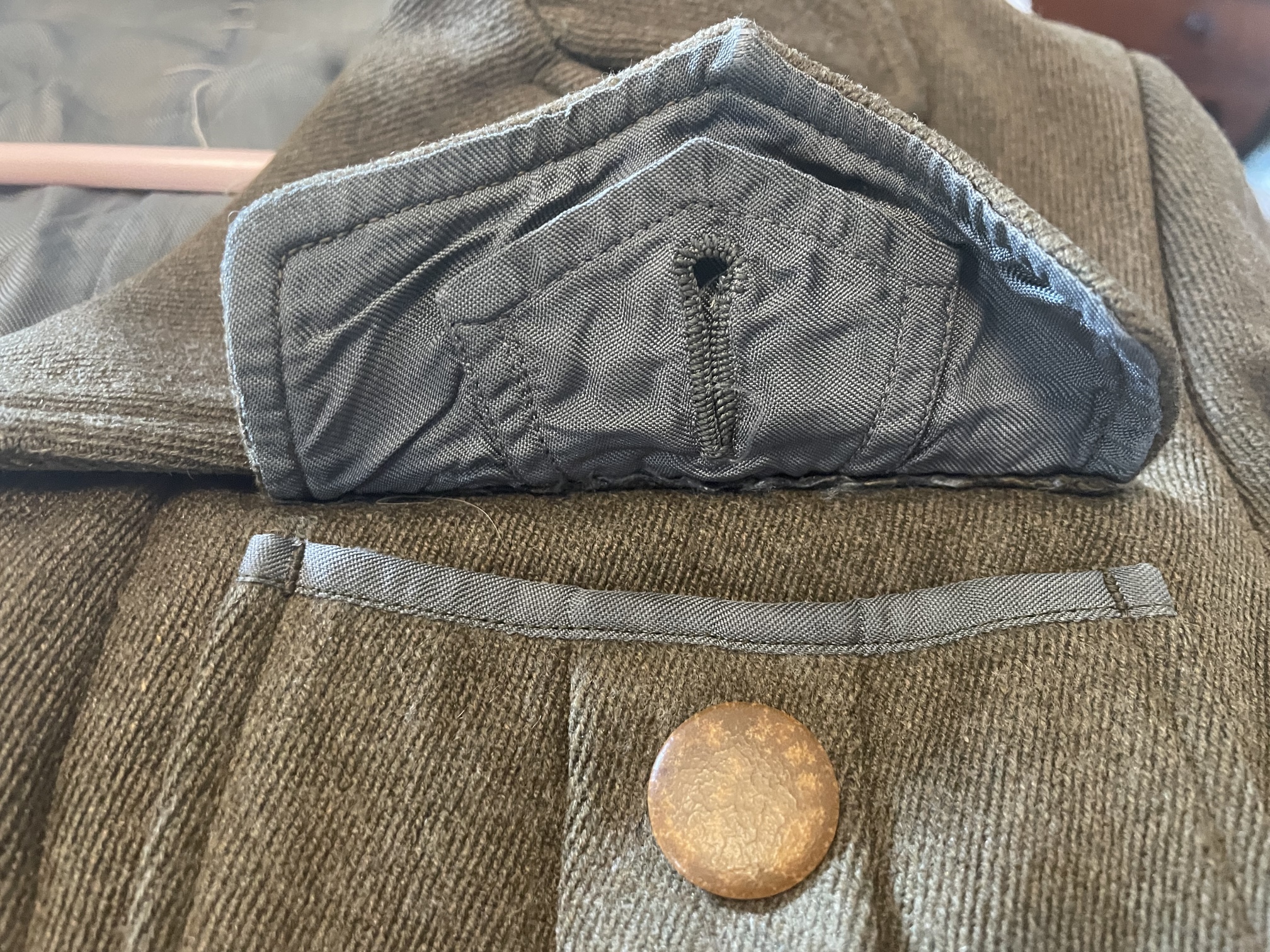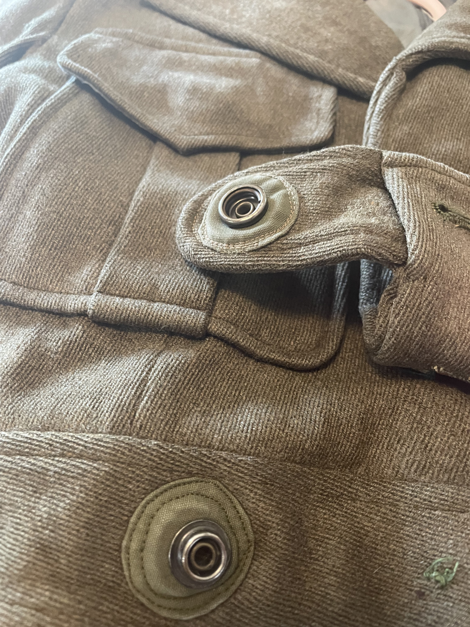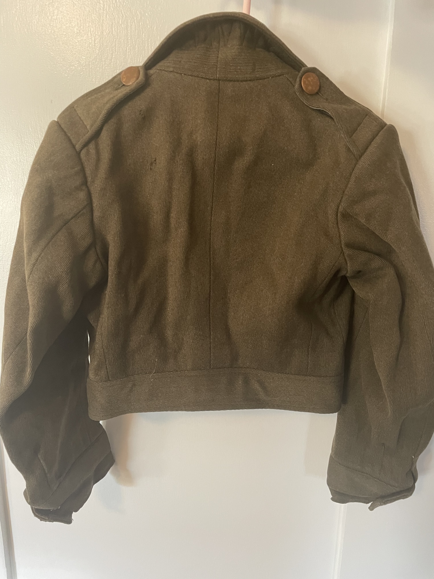 A high-quality green wool "Ike"-style short jacket, with two pleated patch-pockets, and a hidden-button front. Four-button front (bottom button missing), with stap-closed tab at bottom. Brown buttons appear to be Bakelite.