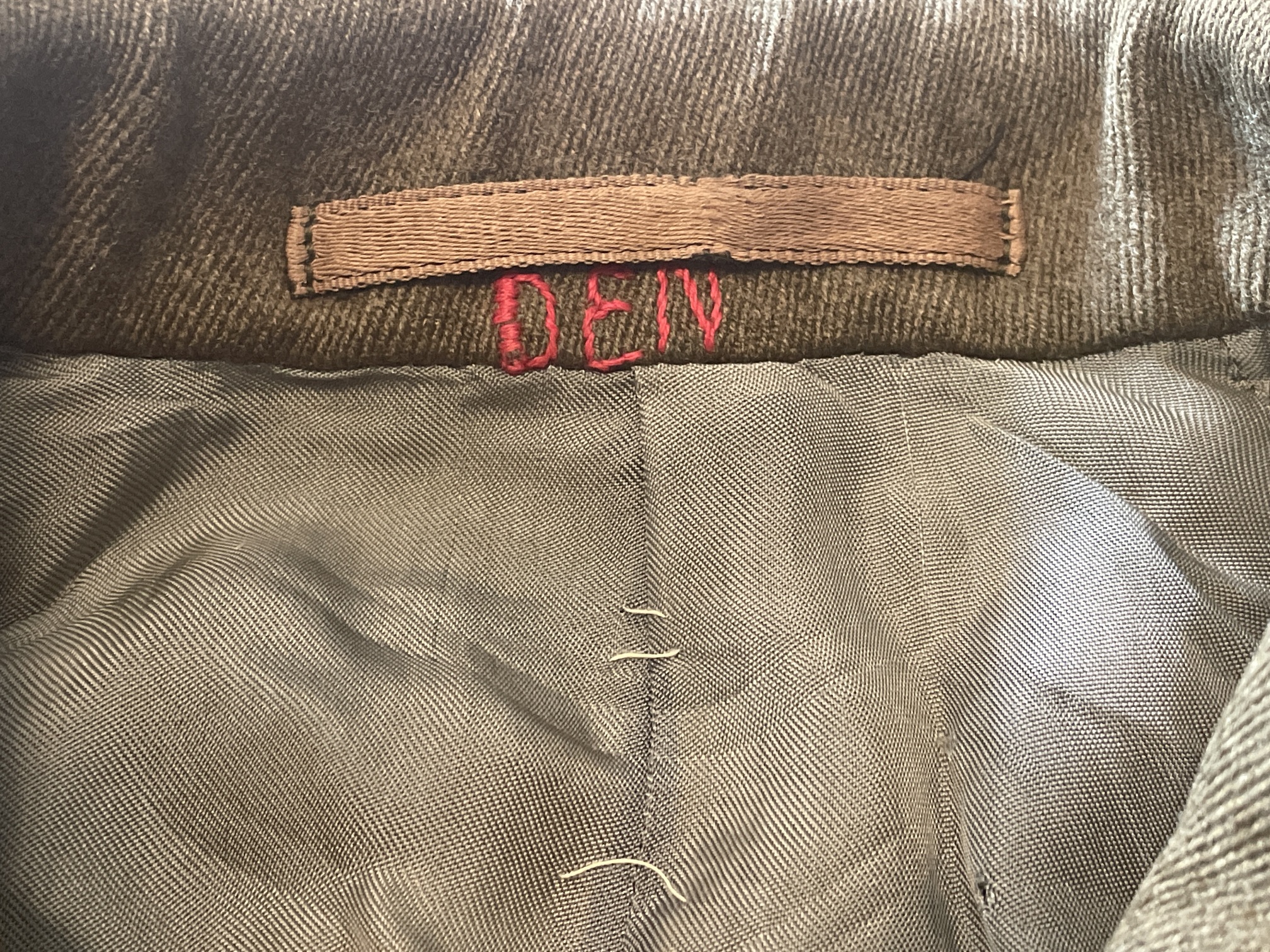 "DEN" crudely embroidered at back of collar.