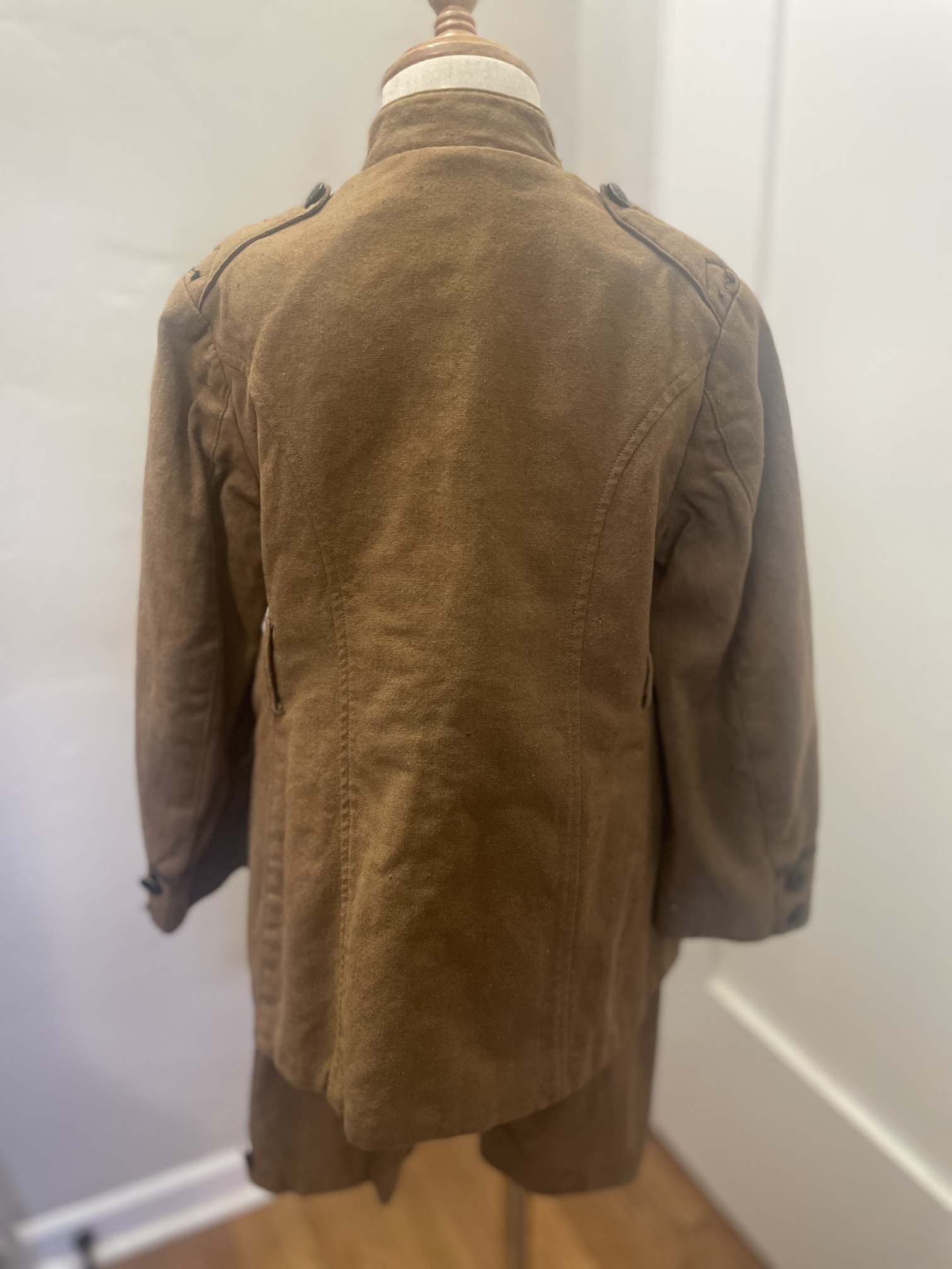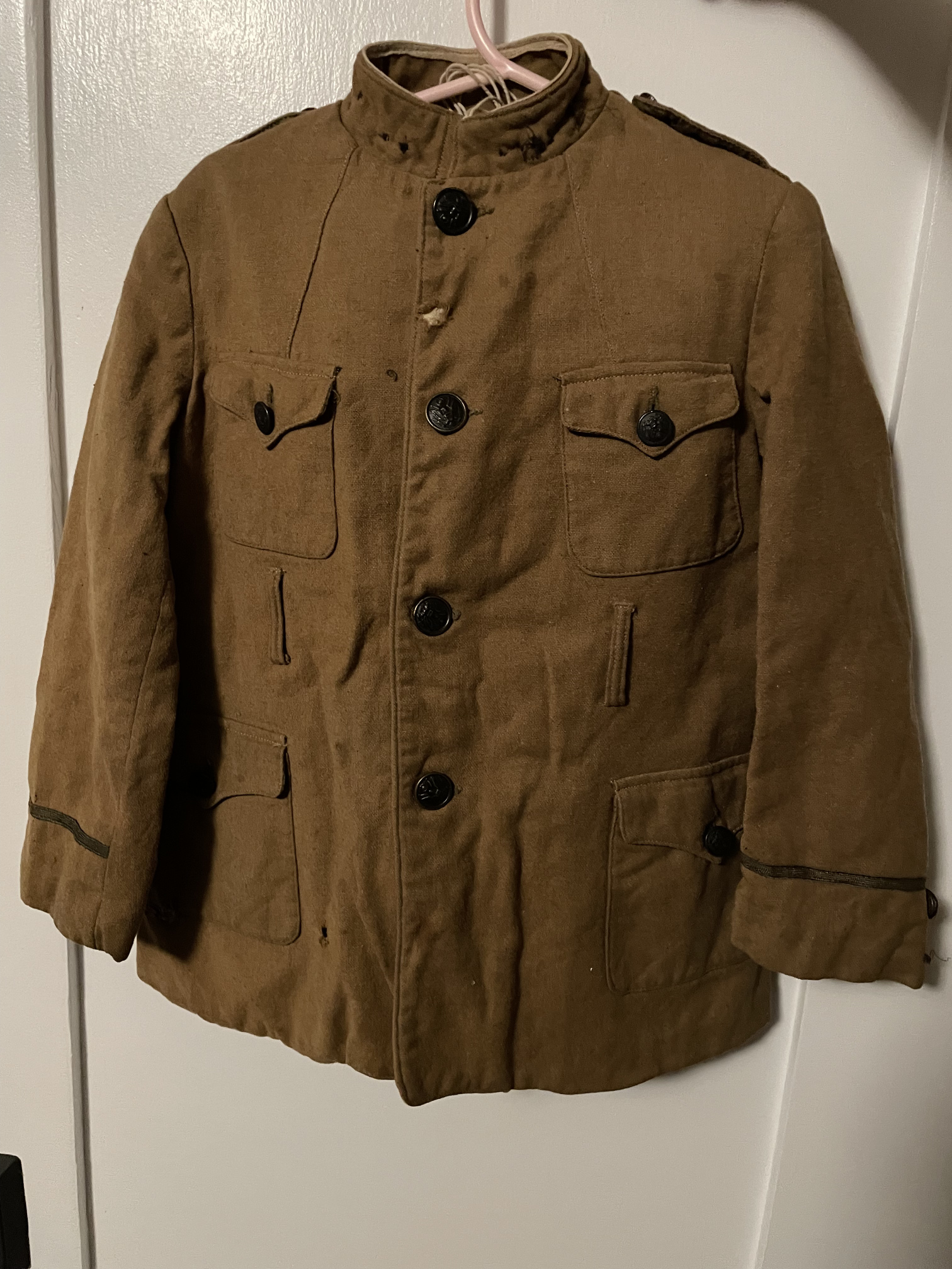 A child's WW1-era Army uniform, similar to the US Army M1917 uniform. The tunic has a four-button front, and four flapped patch pockets. There is a brown or gold stripe at each cuff. The shorts have buttons at the cuffs and sides of the waistband.